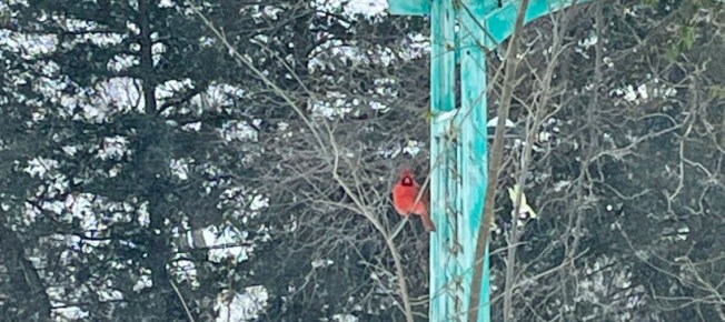My yard attracts a large variety of wild birds, but the one I always smile at is the red cardinal. Seeing that bright spot of red is something special! ~SueBee Note: While my yard looks pretty ragged at the moment, once spring is sprung it will be a wonderland of plants and flowers.