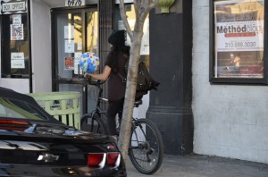 I’d recently attended a street photography workshop called The 24 Hour Project at KPCC’s Crawford Family Forum in Pasadena, met some of the big names in that genre of photography, and become hooked. Now here I was, face to face (read little pickup truck to bicycle) with a wonderful subject. The chase began. I made Kat jump by hollering “grab my camera, get her, get her” while trying to avoid crashing, explaining my urgency in the subject matter, and fending off Kat’s insistence that for sure the girl would see us. Fear to the wind, Kat clicked away… and we followed the girl block after block after block!