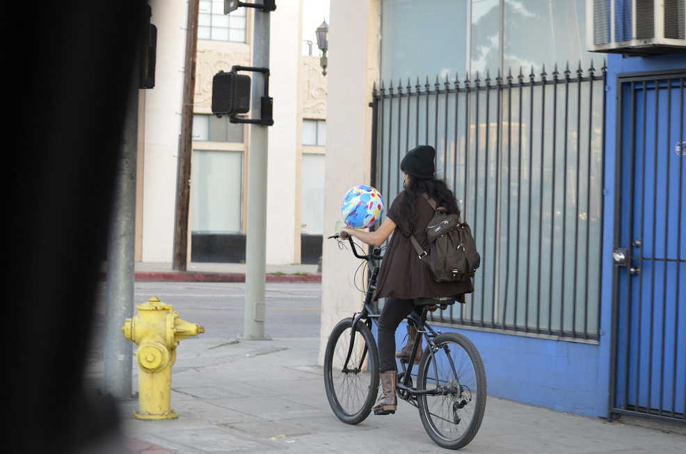 Recently Kat and I were photographing on the Westside, heading homeward, when I chose a random route through Hollywood towards the 101. Traffic was pretty crazy. Well, when isn’t it crazy in Hollywood, but this day was particularly crazy. But, it’s then that I spotted her… Bicycling Balloon Girl! Spectacular! Intriguing! Fascinating! She was all of it, all at once!