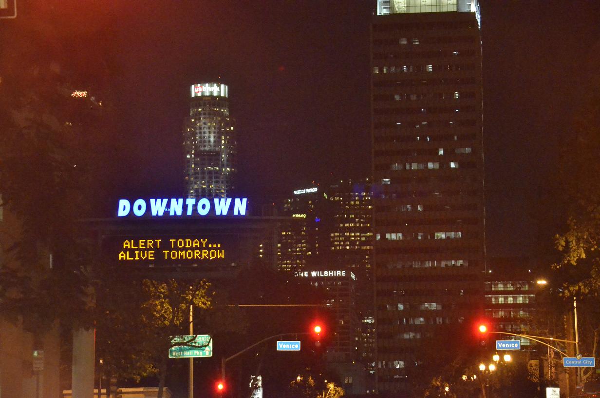 Yup, that’s DTLA signage for you. I’m not sure if it’s an intended warning, cautionary note, or what, but there it is, brightly glaring down at drivers! Approach downtown Los Angeles from the 10, Grand exit, and see for yourself. Kat and I did exactly that this evening while returning home from a family birthday dinner. I decided some spontaneous nighttime pics of L.A. would be preferable to all the pretty red tail lights lined up in front of us. We didn’t have a tripod, nor much experience in night photography, but figured on gaining a bit. I recommend a visit – it’s a beautiful place, kinda eerie in some parts, lock your doors in others, fun to see new trendy cafes bustling with patrons in others. The gallery below is a sampling of pics from our tour, majority taken by Kat, many out the window as I drove. (Yeah, that’s a turbo lens on the camera, resulting in lots to choose from) Enjoy! ~SueBee