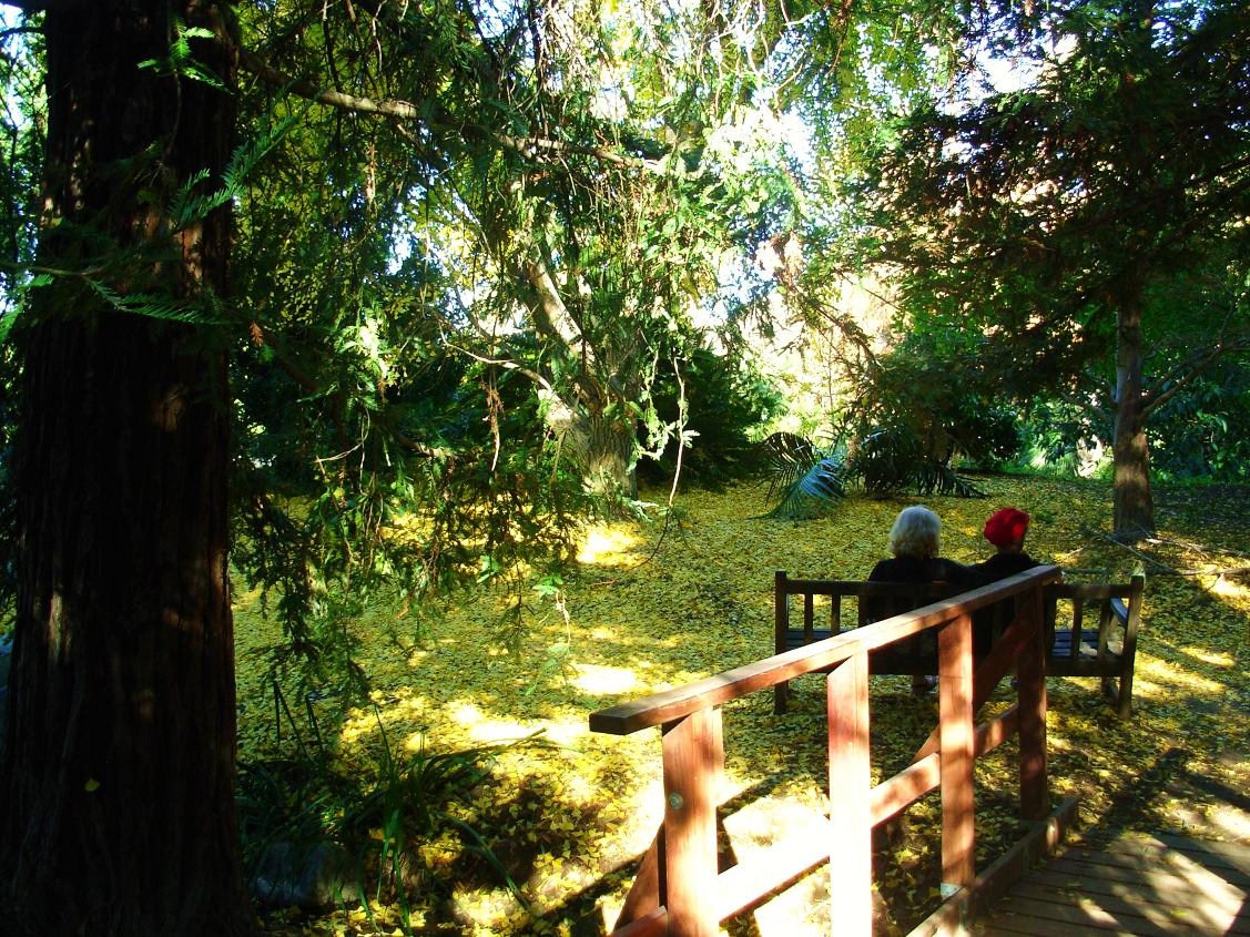 The gardens were nearly empty, the weather brisk, leaves having fallen off trees, but not yet swept away nor turned brown. Silence surrounded me, other than the occasional crunch crunch as I sought out leaves to step on. Approaching a small bridge leading over the creek, I paused. There sat this closely-nestled couple, the elderly gent’s red cap singing a wake-up call of bold color to the yellow blanket surrounding them. I changed my route, refusing to disturb their private enjoyment. In my mind I thanked them for creating a sweet autumn memory. I hope you enjoy today’s Foto Fix. ~SueBee