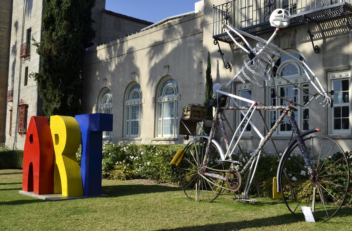 Returning home from another lovely get-away weekend in Palm Springs earlier today, I took a detour off the 60 to visit the Mission Inn (more about that gorgeous place in another post). Approaching on Mission Inn Avenue, I saw this skeletal bicyclist out front of the Riverside Art Museum. Not having enough time for a tour of the museum today, but very curious, I checked their website and found an exhibit titled “Transcending Traditions | Dia de Los Muertos | Day of the Dead” running through November 25, 2013. I hope you enjoy today’s Foto Fix. ~SueBee, pic by SueBee