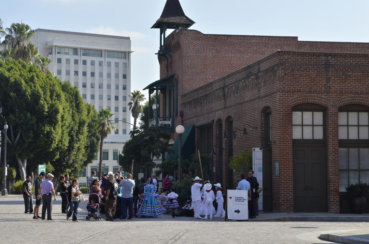 When I took the train to downtown Los Angeles last week, I arrived at Union Station, across from Olvera Street and El Pueblo de Los Angeles historical monument. One of L.A.’s original areas, it’s always fun to visit. The celebration of Dia de Los Muertos was on, so colorful costumes were abundant, music playing, dancers on the Plaza stage. After lunch at Philippe’s, I was able to spend time in the surrounding museums. I don’t remember visiting the firehouse museum before, but discovered it to be fascinating. It’s the red brick building with the bell tower in the picture below.