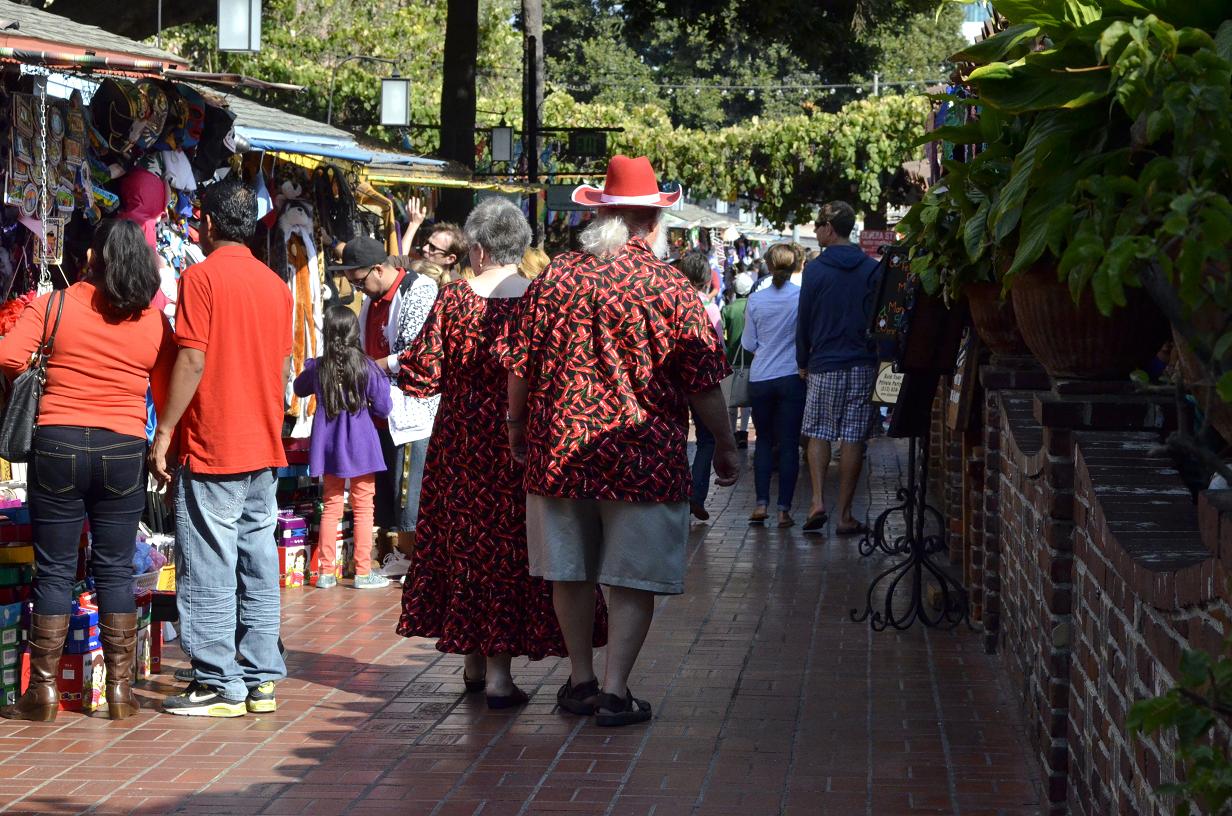 The couple wearing matching chili pepper costumes while walking through Olvera Street… now they really caught my eye! ~SueBee (photos by SueBee)