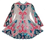 In my previous career as a dress designer, a decade spent designing and making custom Irish Dance costumes (below are pics of three dresses to give you an idea of fabric variety) I drove downtown L.A. several times monthly. Each dress order was unique, and that required unique fabric selections! I had (still have) a large inventory of high-end fabrics (dupioni silks, sequins, metallic silks, etc). With an extensive number of shops, stretching out in blocks from the hub at 9th and Maple, I gradually developed relationships with the shopkeepers. I knew which ones were easiest to barter with, which ones shorted the cuts, who had the best quality, who’d sell small amounts at wholesale.