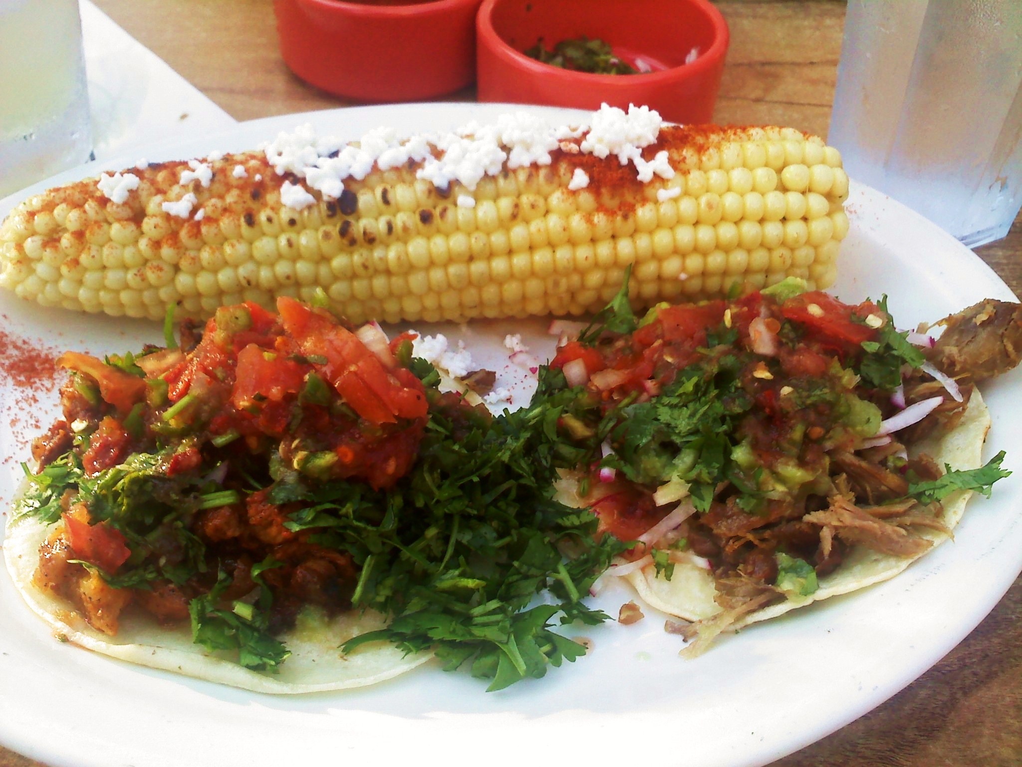 Grilled Corn on the Cob, Carnitas Street Tacos