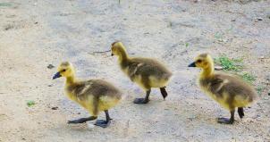 Today’s Foto Fix features three fuzzy, wuzzy goslings marching from the pond to the lawn at Los Angeles County Arboretum in Arcadia. ~SueBee (photo by SueBee)