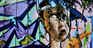 Photo taken in a West Hollywood back alley, north of Melrose, vines adding a bit of whimsy to the artwork. ~SueBee (photo by SueBee)