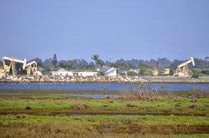 Oil rigs next to homes and wetlands