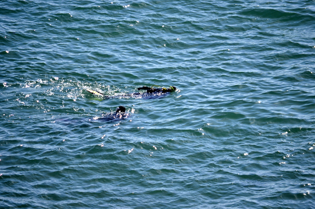 I have so many photos suitable for this week’s Photo Challenge, Enveloped, but ended up with this one of scuba divers skimming the surface, enveloped by their suits and the Pacific Ocean at Corona Del Mar. ~SueBee