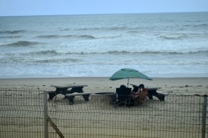 Ironic photo that made me laugh. Note “Hot” on the grill while they sit huddled in their chairs.