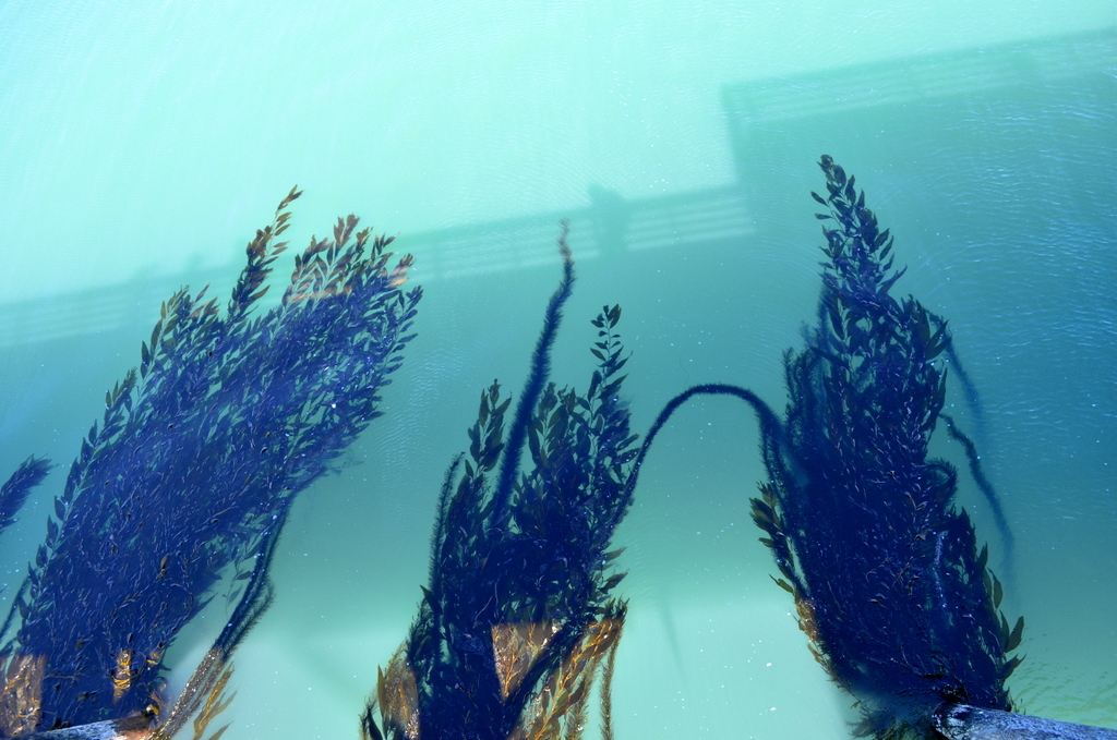 My shadow from the pier, seaweed drifting from each post