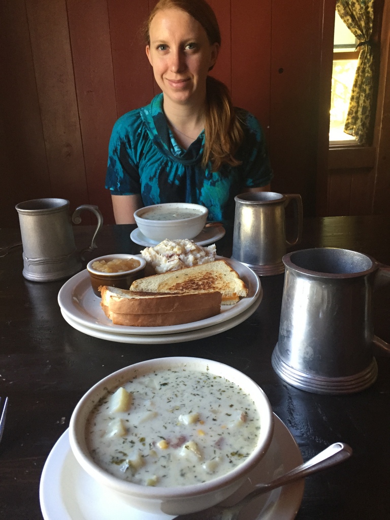 Kat ready to eat the delicious corn chowder at Hawk’s Head