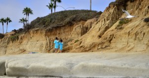 I took this picture near Encinitas and didn’t notice the seagull until I was back home, reviewing my pics. The two little girls in matching blue robes is what had caught my eye. ~SueBee