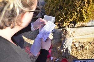 Angelika reading the Geocache log we found at the graveyard
