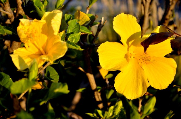 Daily Foto Fix taken at the golden hour of a beautiful yellow hibiscus blooming in my front yard. ~SueBee