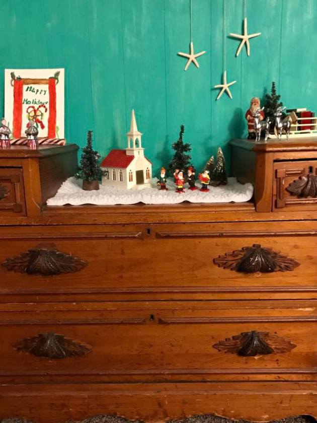 Here’s wishing a very Merry Christmas to my friends who celebrate and wonderful holidays to everyone. I used my iPhone to take this picture of the little Christmas scene I set up in my living room. Most of the items in the scene have been in my family for years. The Santa was from my parents first Christmas after they married in 1937. The Happy Holidays sign was painted by my mom when she was 95. ~SueBee
