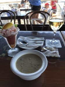 Clam chowder, shrimp cocktail, sour dough bread, and a nice glass of wine!