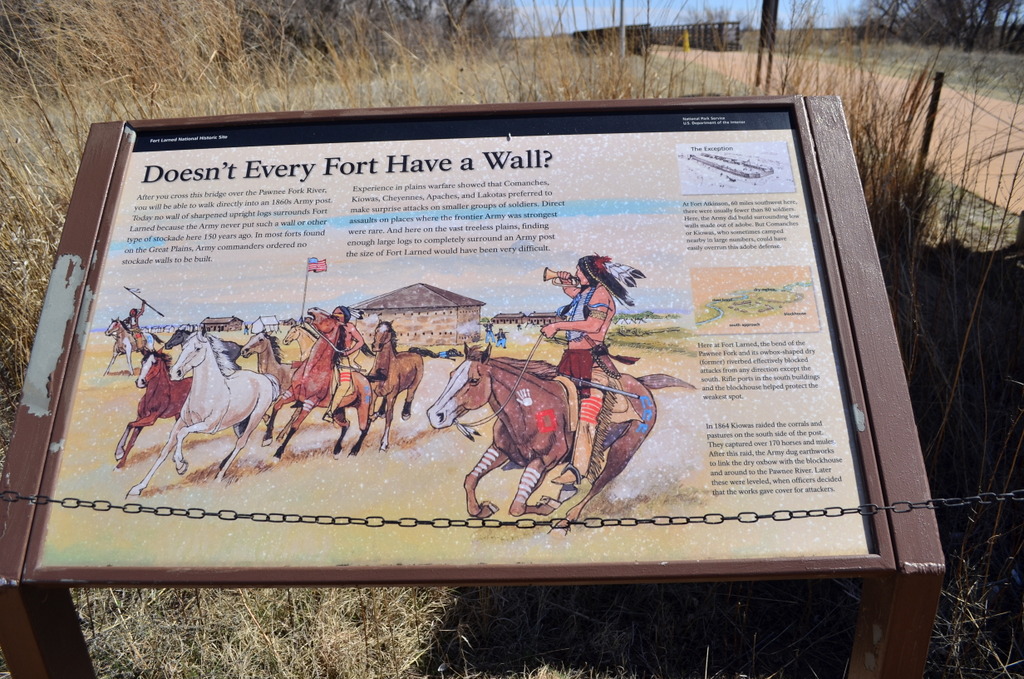 “The Camp on Pawnee Fork was established on October 22, 1859 to protect traffic along the Santa Fe Trail from hostile American Indians.[2] It was renamed Camp Alert in 1860, as the small garrison of about 50 men had to remain constantly alert for Indians. In May 1860 it was moved upstream, 3 miles (4.8 km) 30 miles to the west up the Pawnee Fork, and by the end of the month was renamed Fort Larned. It served the same purpose as Camp Alert and as an agency for the administration of the Central Plains Indians by the Bureau of Indian Affairs under the terms of the Fort Wise Treaty of 1861. The fort’s service ended as a combination of the tribes’ relocation to reservations and the completion of railroads across Kansas that ended the need for the Santa Fe Trail.