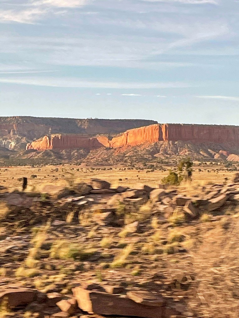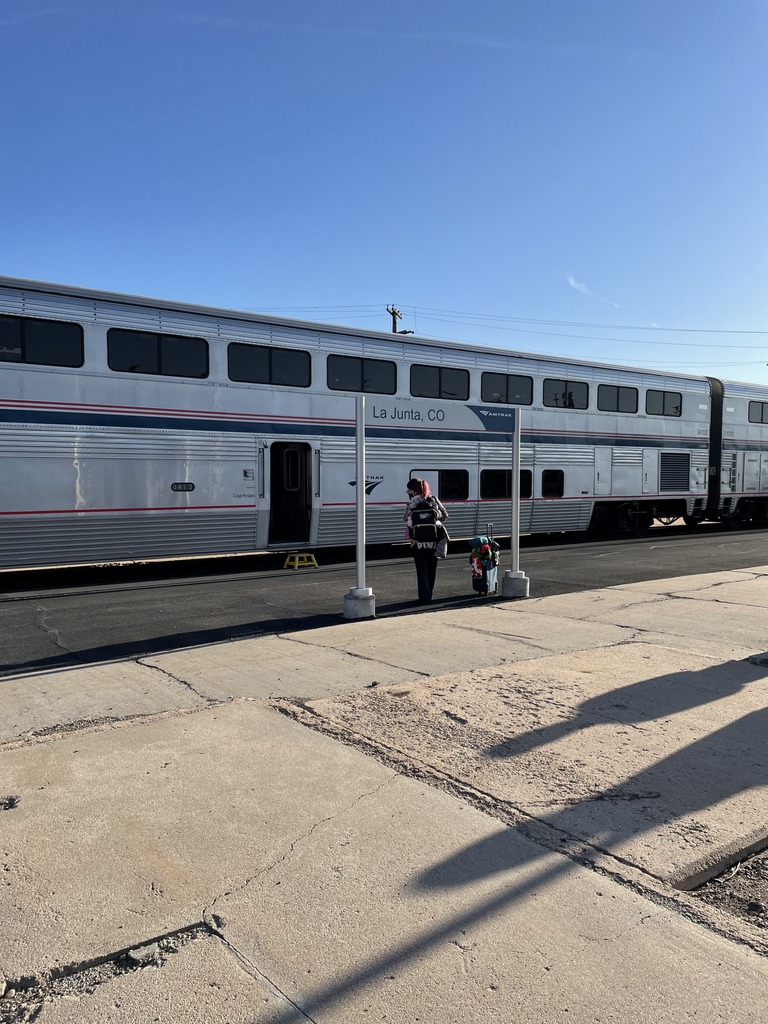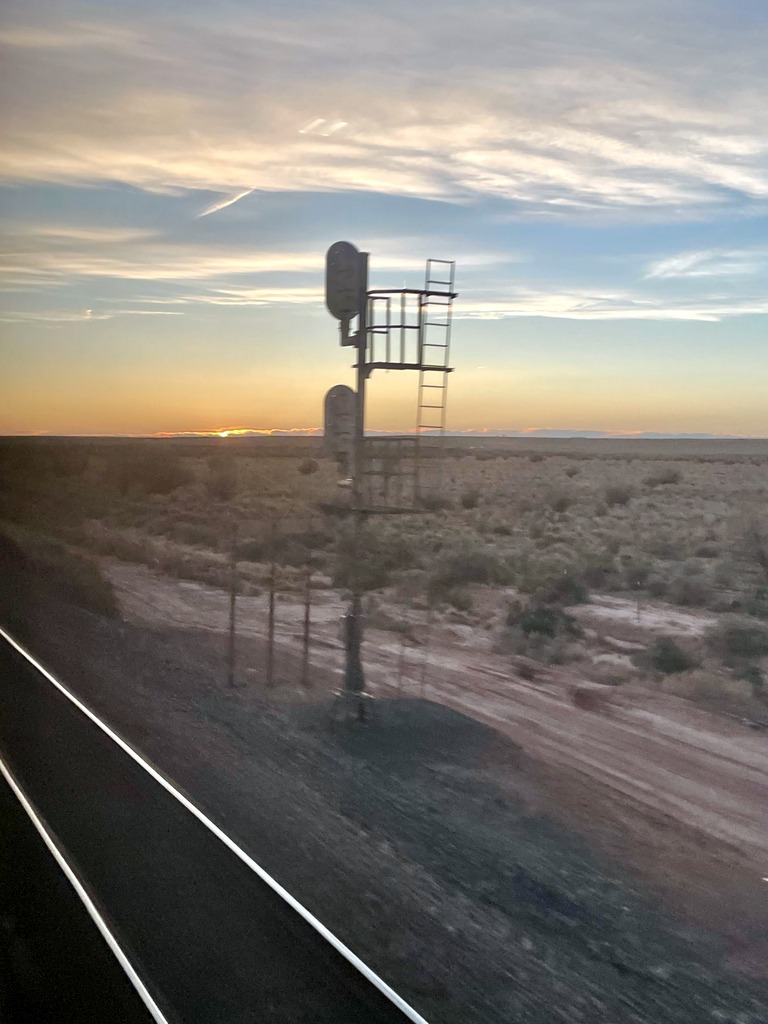 The scenery on the Southwest Chief line was breathtaking. I’d brought a really good book along, but didn’t crack it open until after dark. We had several “fresh air” breaks for smokers and others to get off and stretch their legs. I walked up and down the train itself several times and never felt cramped up. I also made good use of the observation car, and purchased coffee and snacks from the tiny cafe downstairs. The restrooms were small, but clean, much like on airplanes. I look forward to my next train ride, and am already looking at the various routes. All aboard!! ~SueBee