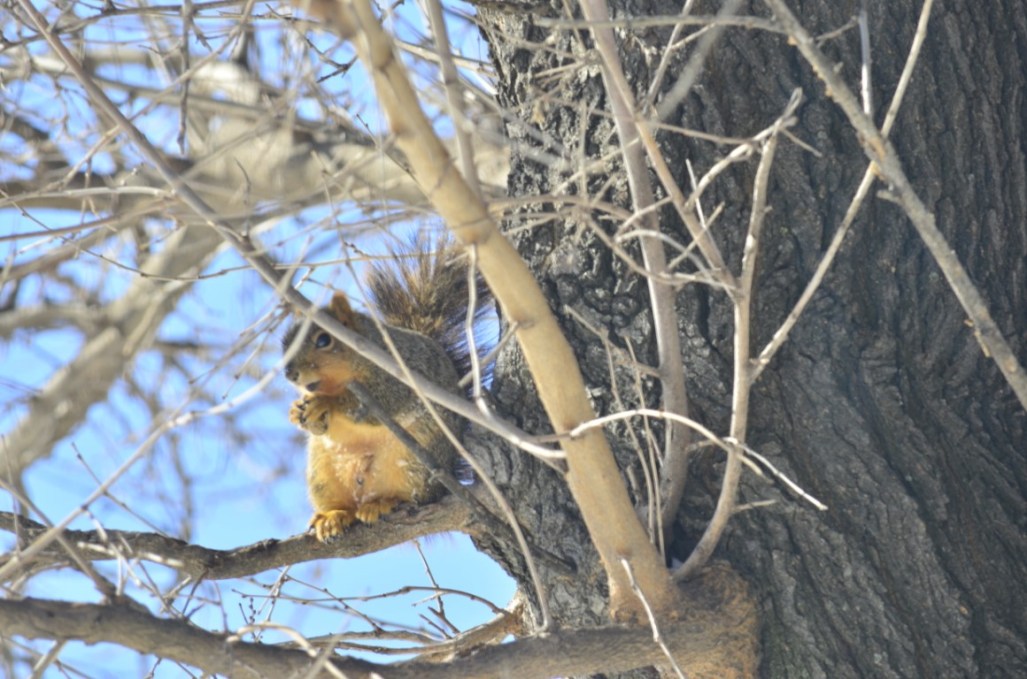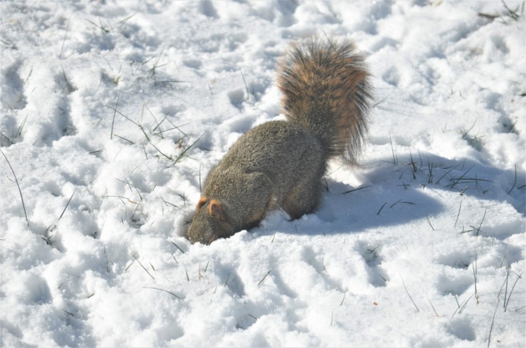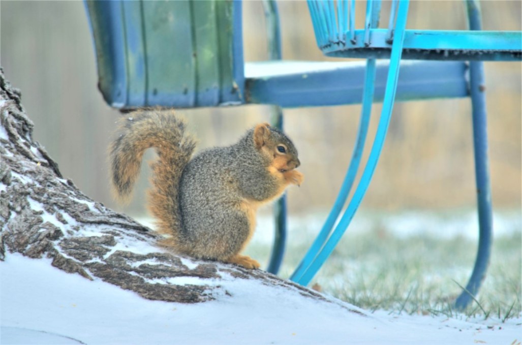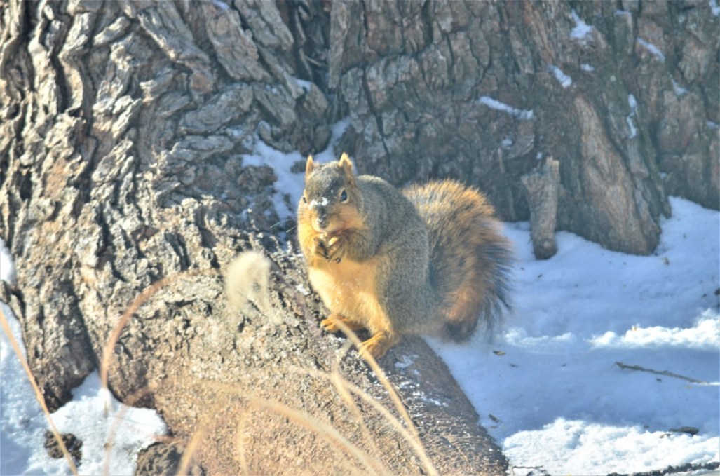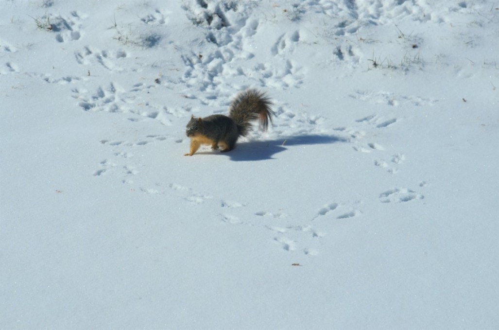 I’ve been so entertained since living at my new house by the scurry (I had to look up that word!) of squirrels in my backyard trees. I’ve rewarded them their cuteness by buying sacks of special dried corn on the cob, and unshelled nuts. Watching them after the recent snow was especially fun. They’re really characters, some days reminding me of the Keystone Cops as they chase each other wildly up and down, round and round, onto skinny branches, nearly falling sometimes, and often dropping a prized ear of corn. To see a tiny squirrel grab the corn cob, rush up the huge tree, then leap to another branch, is a sight, I tell you! ~SueBee