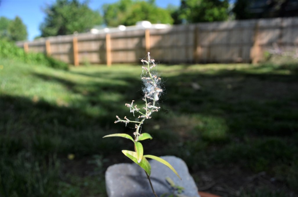 Today’s Foto Fix shows a bit of fluff caught on the little lemon verbena herb plant I recently potted. The fluff, which is actually seed pods from the numerous cottonwood trees in the area, flies through the air here looking like snow flakes. It catches on everything and I’m sure must be quite annoying to people with seasonal allergies. ~SueBee