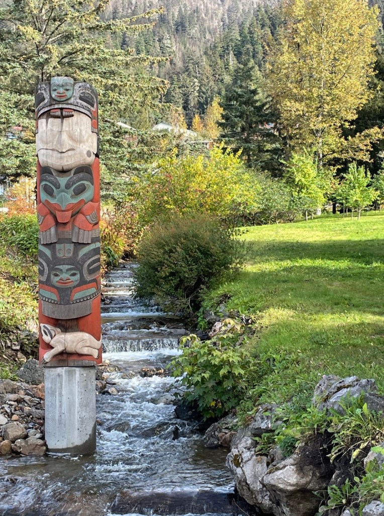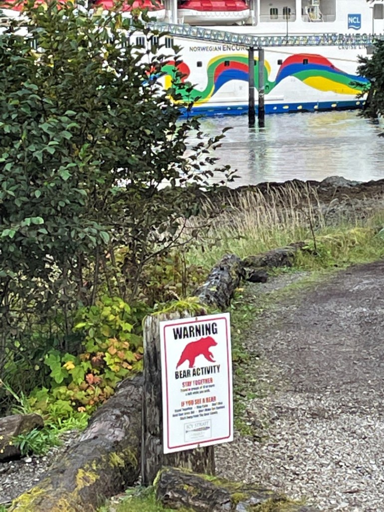 My return walk to Icy Strait Point and the cruise ship followed the same path but with a different perspective. I gathered with patrons of The Office bar to watch as a black bear walked along the island opposite, noticed a pictograph on a rock wall, and decided on a tram ride to the other side of the inlet. Once back on board, I ordered a Mojito and watched as a bald eagle landed in tree across the way. Indeed, it was a fabulous day at Icy Strait Point and Hoonah, Alaska! ~SueBee