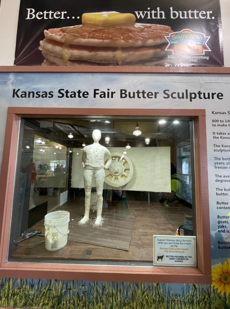 I changed route for my morning walk yesterday, opting for the Fairgrounds rather than my neighborhood. It was opening day of the State Fair which is held in Hutchinson where I now live, and I figured I’d do a brief look-see. (I bought a ticket and plan to spend a day there next week when the temps are forecast to be in the upper 70s rather than the 90s.) I parked a few blocks away (free parking) and walked to the entrance. Since it was opening day and before 11am, I got in for free. In the gallery below, you’ll see just a few pictures I took. More will come next week when I spend additional time wandering around. I have to say the highlight was watching four people (dad, mom, two teenagers), the dad being a very tall, muscular man, trying to pull a stubborn cow where she clearly didn’t want to go. A teenage boy saw me watching and edged over next to me. He laughed as he said they’d been going at it for at least 45 minutes…. and that the cow hadn’t been properly trained. I didn’t take a picture as I didn’t want to embarrass them further. The frustration in the air was thick, but was the visual definition of stubbornness. ~SueBee