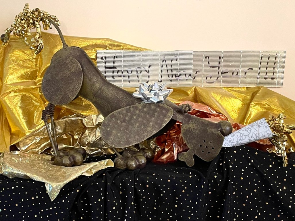 Here’s wishing all my blog friends and followers all the best, and a very Happy New Year. This picture features my “pup” that I adopted last year. Due to my living alone status, many of my friends often suggested I get a dog or cat. I personally couldn’t take the risk of medical bills which can really add up with a pet, in addition to boarding costs when I’m off exploring or visiting family. While wandering through a vintage shop in Wichita, I spotted this cute metal dog. He was on sale and cost less than $20 so I bought him. I took a picture and posted to my Facebook, saying I’d adopted a dog. I guess some of my friends didn’t see the picture before offering their congratulations. Many humorous posts ensued and thus started an ongoing bit of fun I’ve had arranging and taking pictures with my pup. I named him Mr Chips after my childhood best friend’s basset hound. ~SueBee