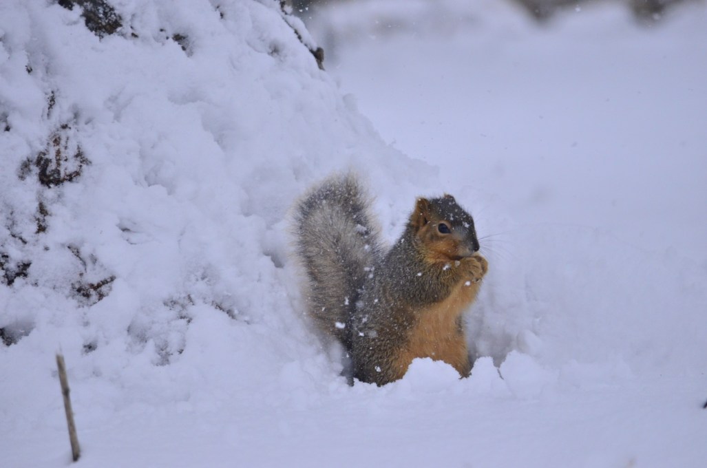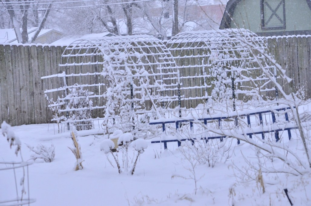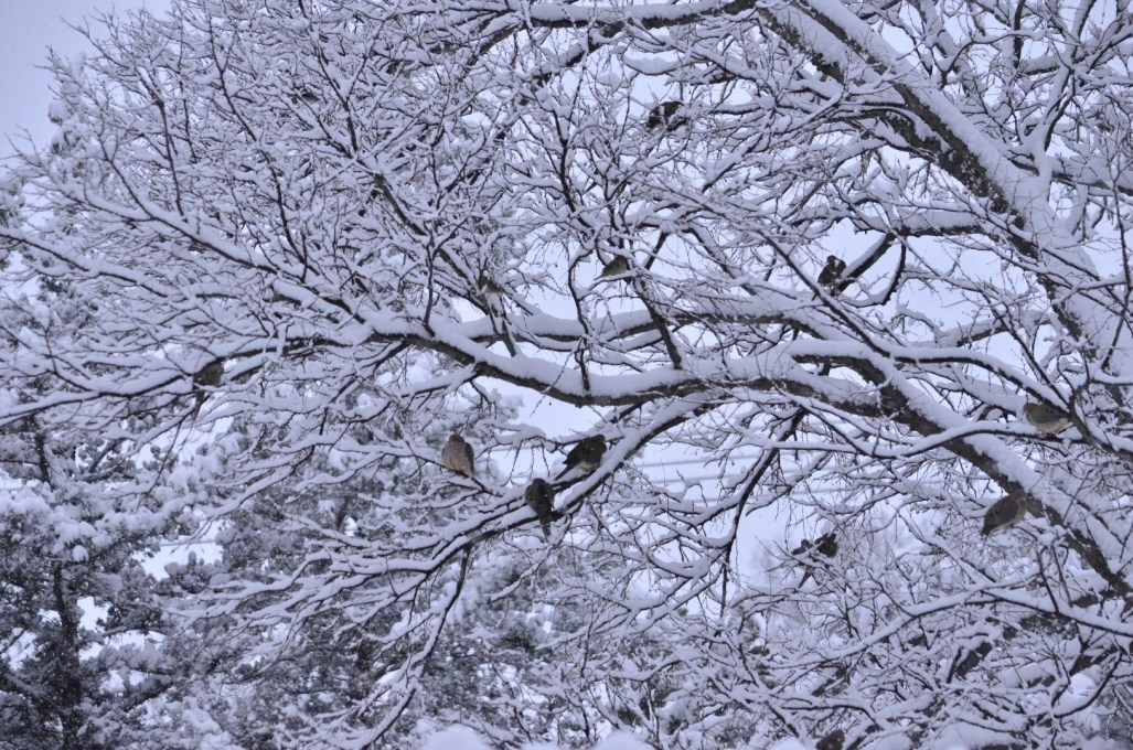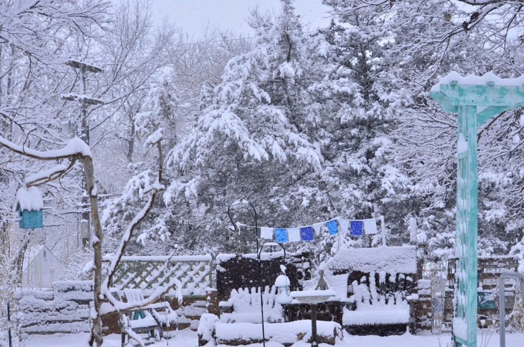 Our weather forecast was quite accurate… 2-5″ of snow expected starting during the night. It’s still snowing right now, mid morning, and it looks to me like 3-4″ has already settled. Lovely to gaze at, probably not so nice if having to get to a job. Ahhh, the joys of being retired! ~SueBee