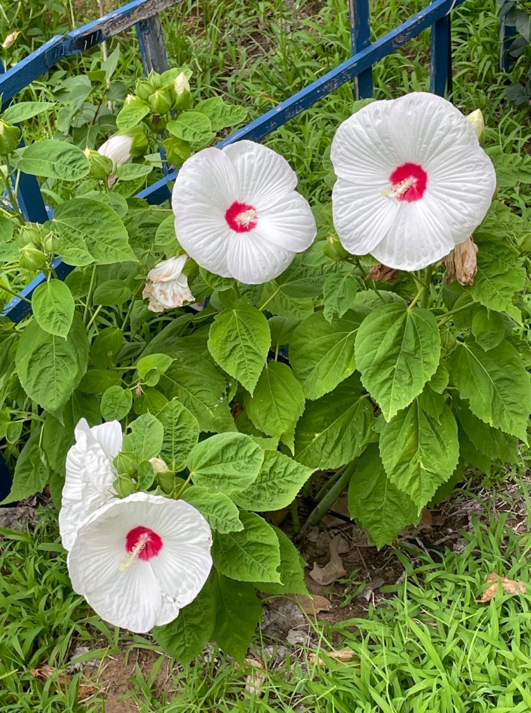 I’m so pleased with the two hibiscus bushes I planted last year, but I’m particularly fond of this white one. As you can see, if you look closely, a bumble bee is enjoying it, too. ~SueBee