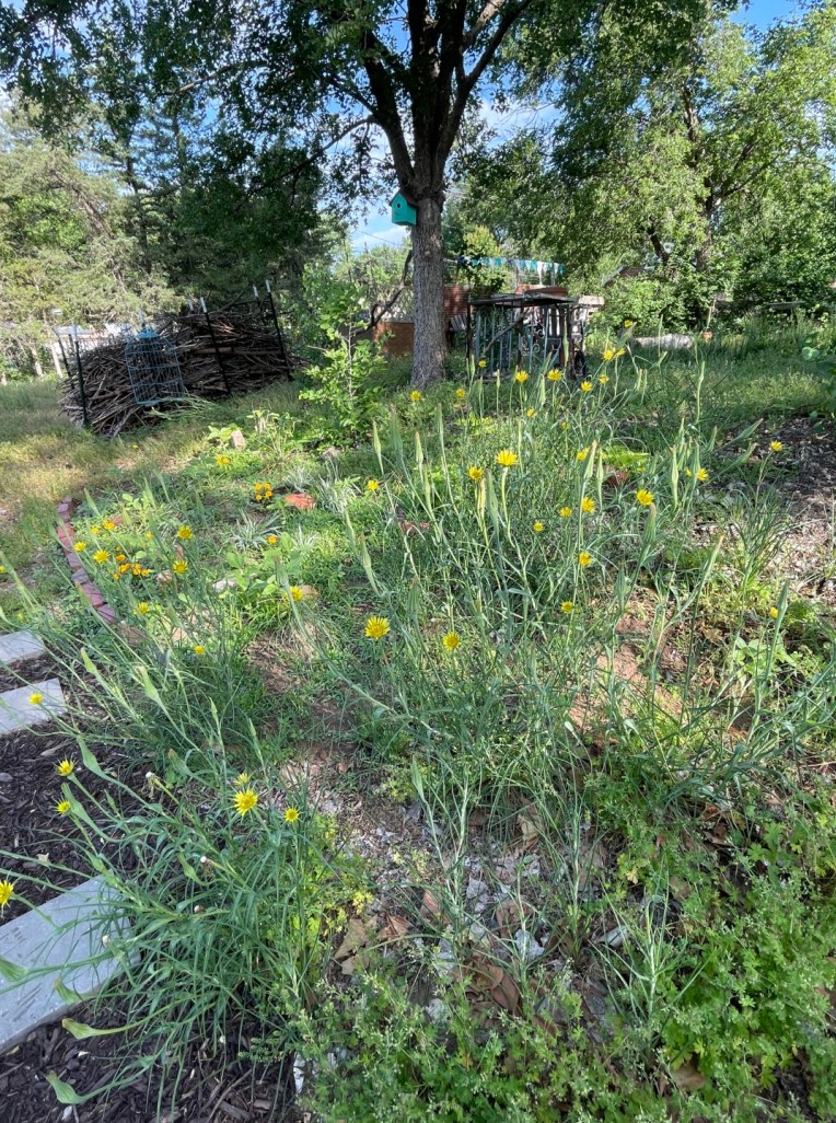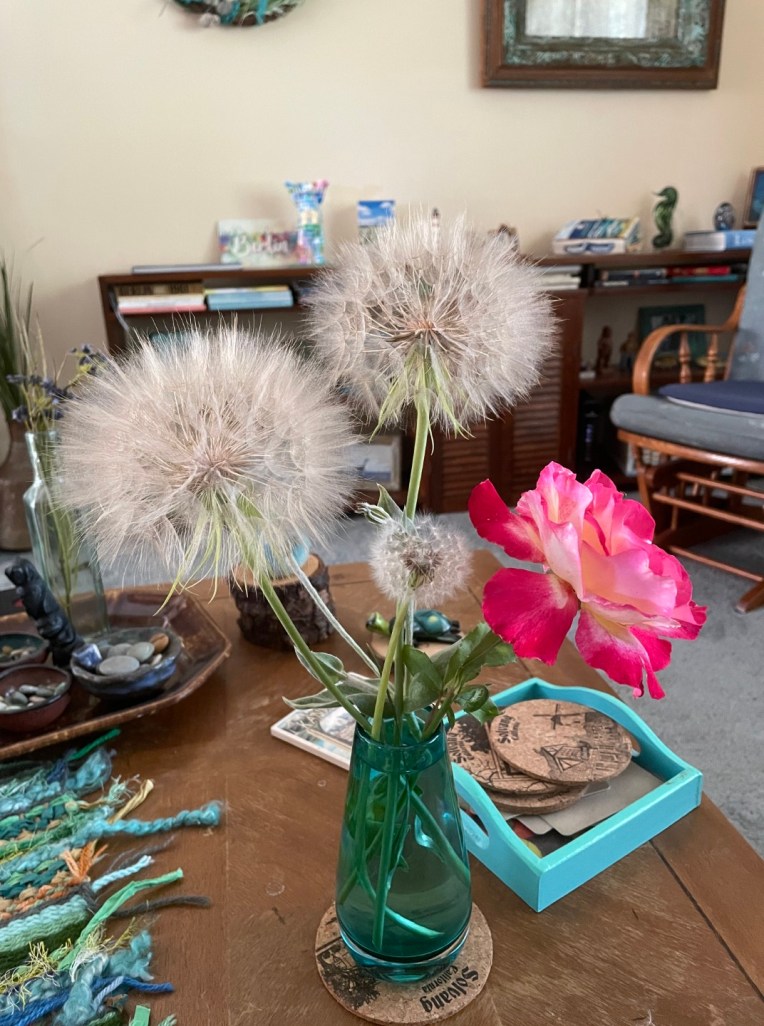 I’ve been tickled pink, to use an old-time expression, with the giant poofballs growing in my backyard. The plant is actually yellow salsify, or tragopogon dubius, but I refer to them as poofballs. The past two years or so I’ve let nature reclaim my backyard, and have been thrilled with all the flowers, plants, grasses, and trees that have grown on their own. This particular plant has brough more than one smile to my face. You’ll notice in the final picture the size of the salsify when put in a vase alongside a regular dandelion and a very pretty rose. I’ve had them inside for many days by now and they haven’t lost any bits (whatever those bits might be called). I hope the pictures make you smile, too! ~SueBee