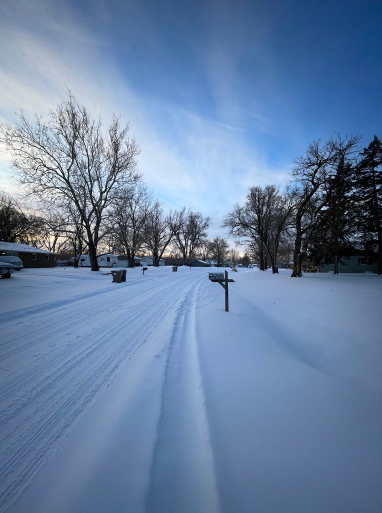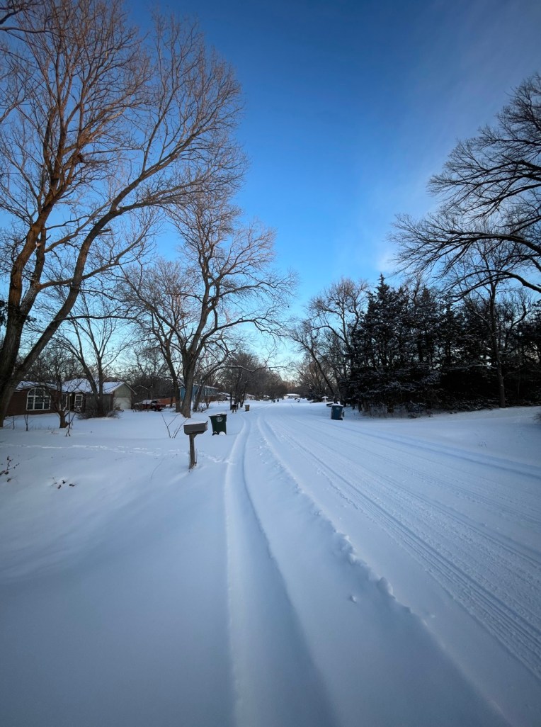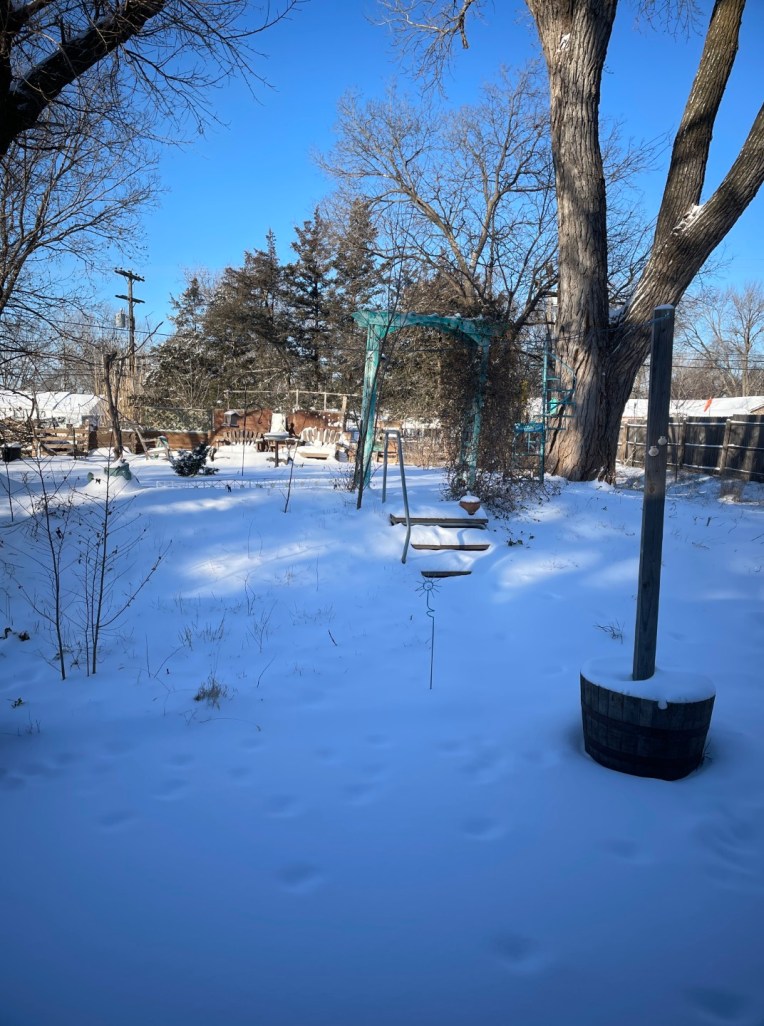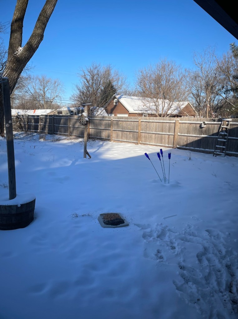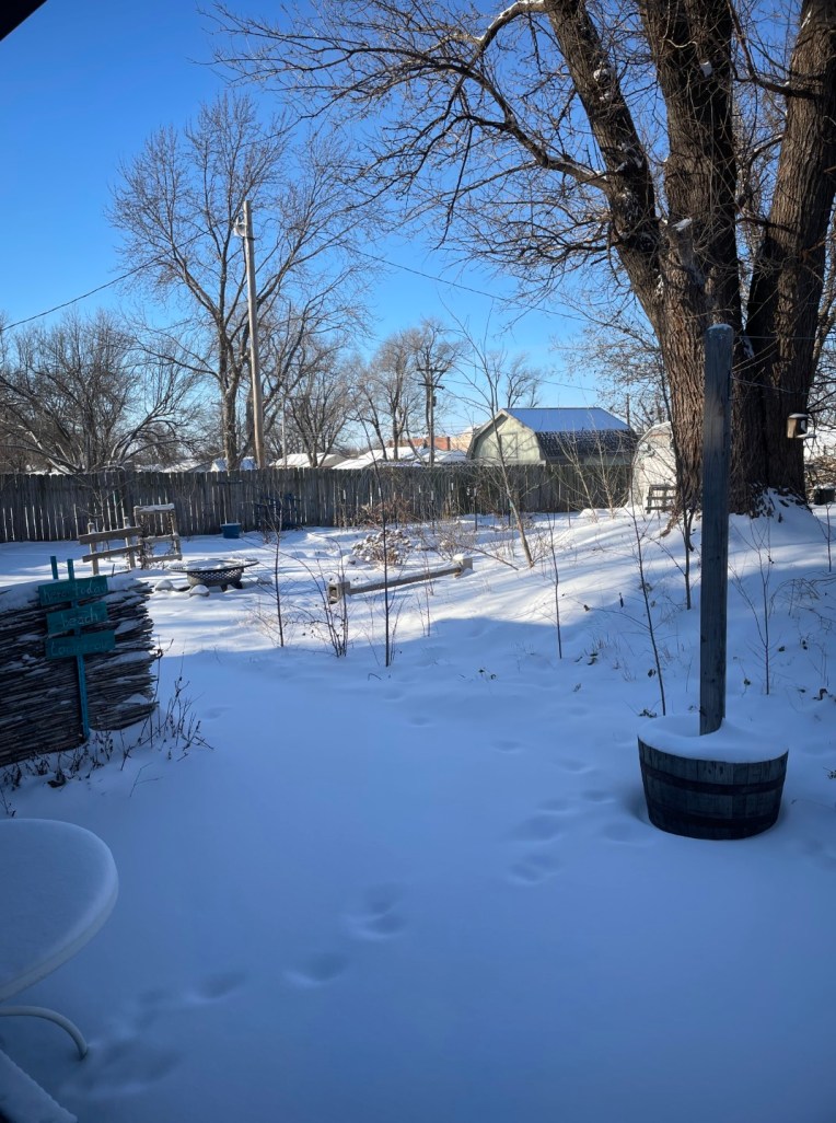 PS: You might notice a tray of seeds that I laid out for the squirrels and birds, rather than trying to get up the steps to where the feeders are. The tray from yesterday was nicely picked clean and then buried somewhere under the snow. What looks like tracks in the backyard snow are most likely from the squirrels and birds yesterday. I didn’t venture past where I set the tray.