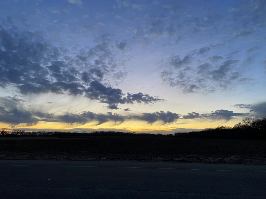 I read that a restaurant about six miles from home, Carriage Crossing Restaurant in the Amish village of Yoder, was serving their annual fried filet of catfish Fridays during the season up to Easter. Late afternoon this past Friday, I took myself out to early dinner. The meal was delicious, the portion very generous and more than I could finish. I enjoyed it immensely and as I took my packaged-up leftovers with me and started the drive back home, I pulled over to get a couple pictures of the beautiful clouds off to the west. ~SueBee