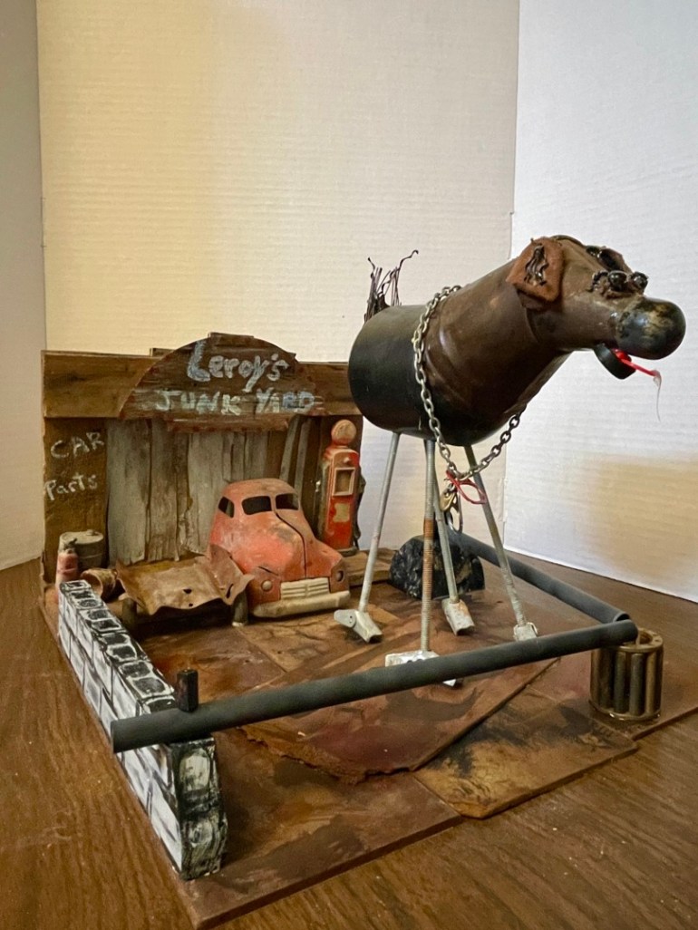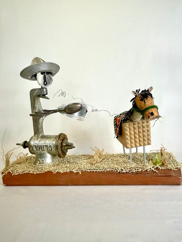Note, I started making these in January, 2024, and as of January, 2026, I have fifteen completed. I’ve had so much fun, using my sometimes whacky imagination, scrounging materials from junk stores and yard sales, and on occasion, my own home. I never spend more than a dollar or two, although in making Solvang the Ostrich I did spend $5 on the creepy doll. I generally let the materials speak to me, and the pieces evolve organically. With Solvang, though, I really wanted to make an ostrich. It’s the favorite animal of my oldest daughter Angelika’s longtime partner, Baldur. There’s an ostrich ranch in Solvang, California they visited a few years back, hence the name I chose for the piece. ~SueBee