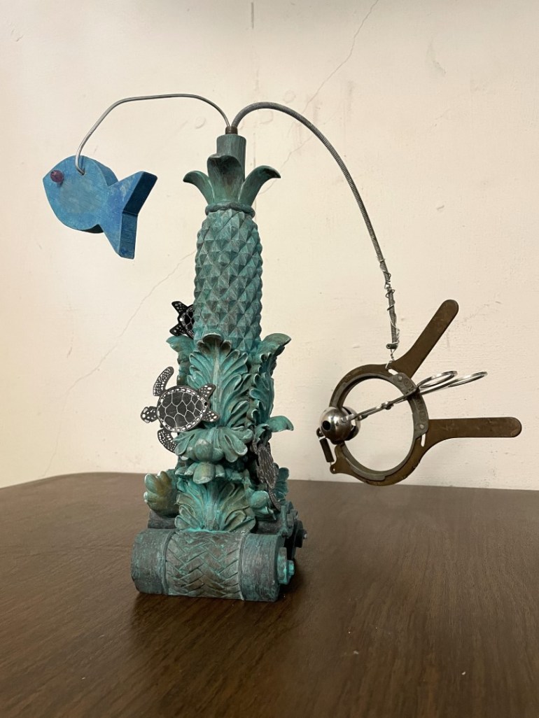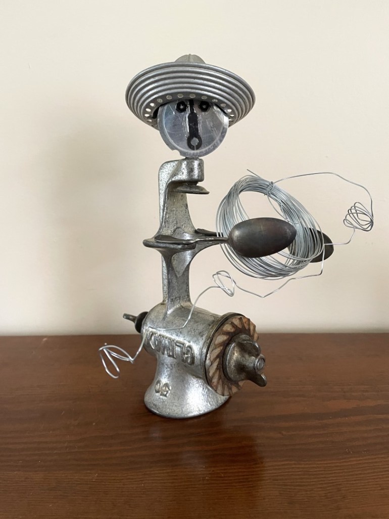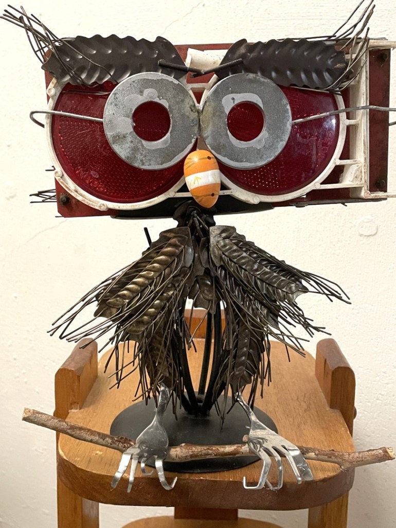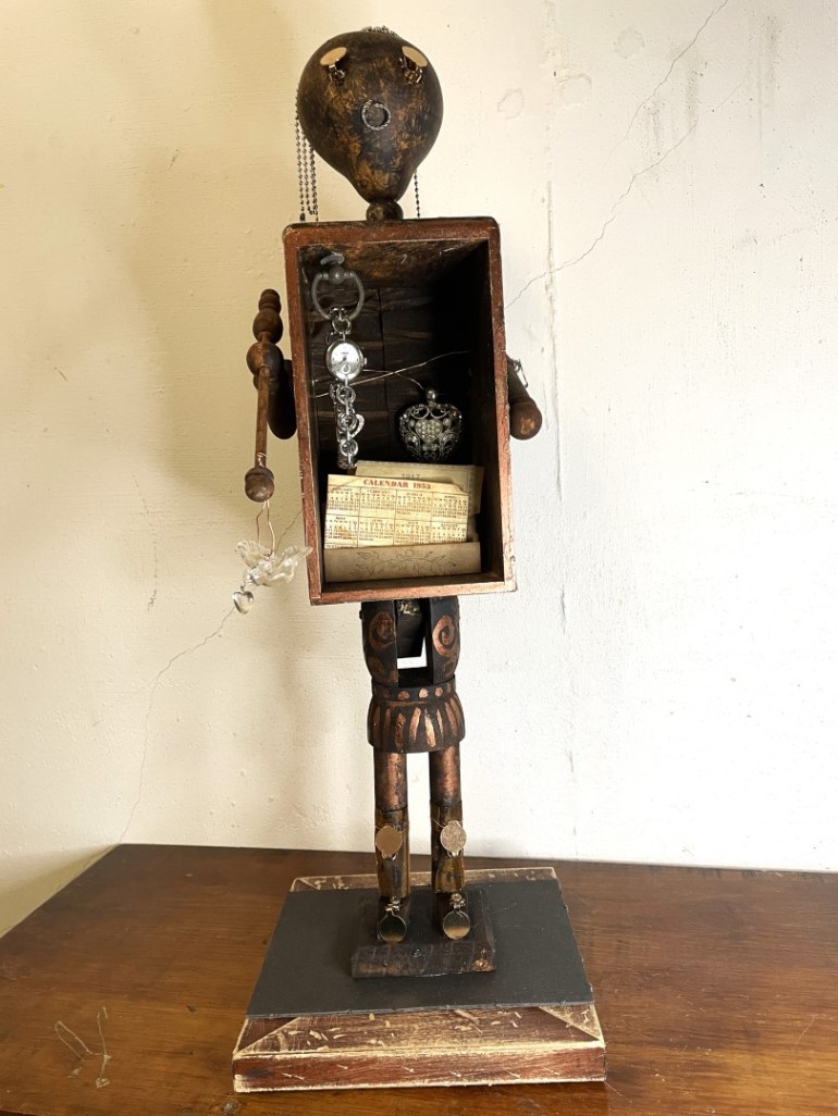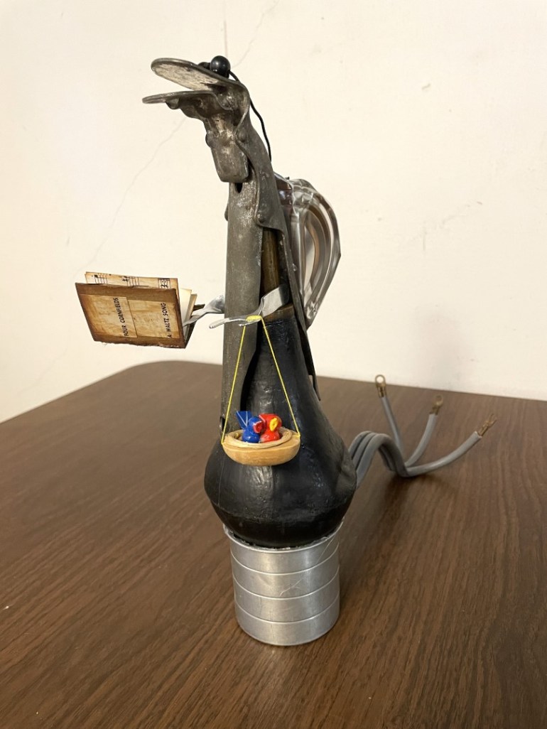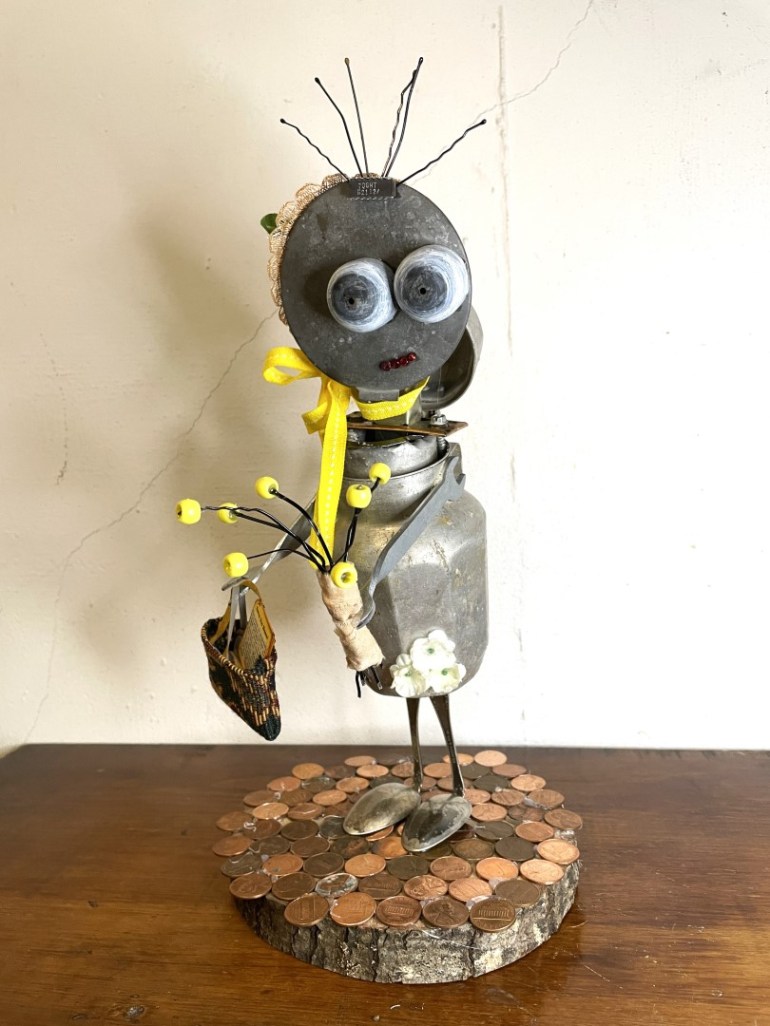 Note, I started making these in January, 2024, and as of August have completed 14. I’ve had so much fun, using my sometimes whacky imagination, scrounging materials from junk stores and yard sales, and on occasion, my own home. I never spend more than a dollar or two, although in making Solvang the Ostrich I did spend $5 on the creepy doll. I generally let the materials speak to me, and the pieces evolve organically. With Solvang, though, I really wanted to make an ostrich. It’s the favorite animal of my oldest daughter Angelika’s longtime partner, Baldur. There’s an ostrich ranch in Solvang, California they visited a few years back, hence the name I chose for the piece. ~SueBee