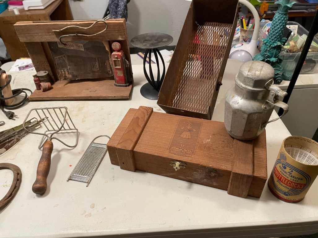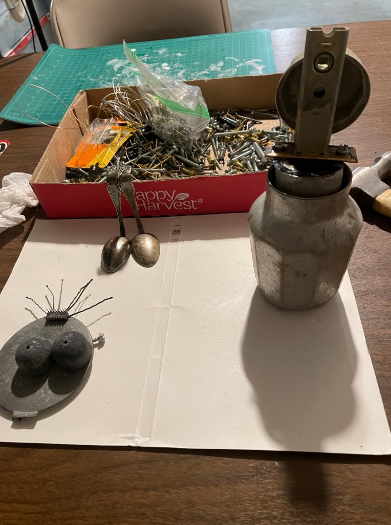 My second Assemblage is named Charlene, Keeper of the Bees. Charlene has just come from a Save the Bees rally and is pondering her next steps of activism. Charlene is made from a very old tin pitcher, the guts of a lock set, the lid from another tin pitcher, two wrenches, two antique spoons, a wood slice, pennies, bobby pins, and other bits and bops that added the personality. If you zoom in on the 8th picture you’ll notice Charlene has a Save the Bees flyer in her handbag. Charlene evolved after I had the face laid out and noticed the pitcher could make a cute body. She was completed in February, 2024. ~SueBee