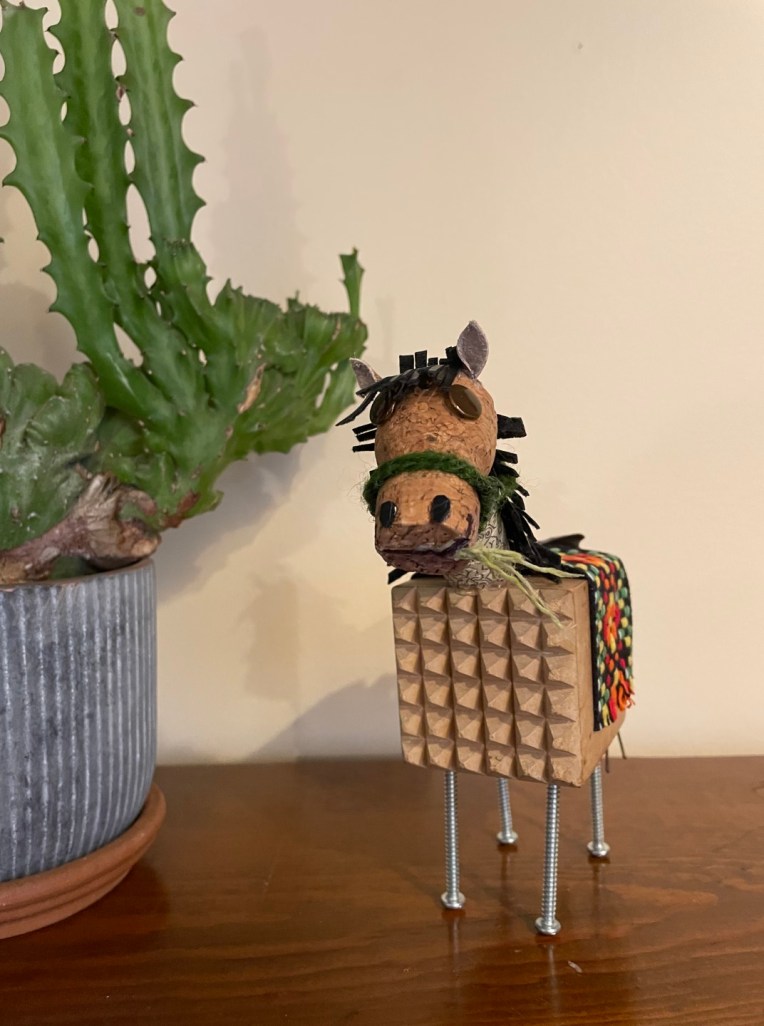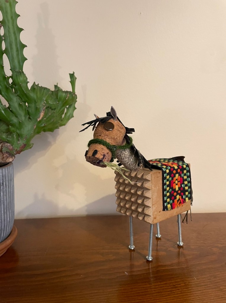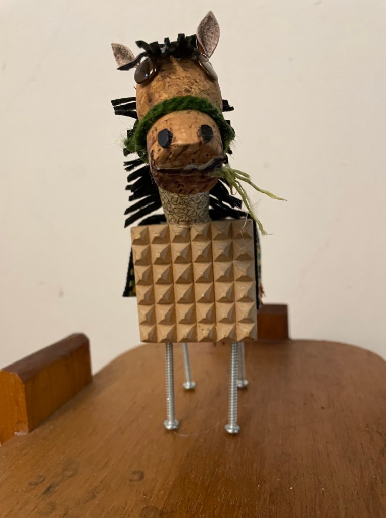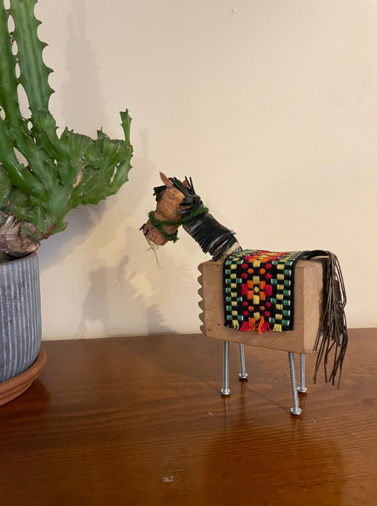 Assemblage number 6 that I named Fastrunner after a very small stuffed toy horse with a broken leg I had as a child. My brother asked me not too long ago if I still had it… now I do! The body was my mom’s meat tenderizer. Fastrunner was completed in April, 2024. ~SueBee