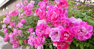 Photo taken two days ago, of the prolific group of roses directly outside my apartment front door. They bloom, and bloom, and bloom… mostly this bold pink, but I’ve seen an orange peeking out along one side, and a white in the middle of the group. It doesn’t take much for me to stop and smell the roses!! ~SueBee (photo by SueBee)