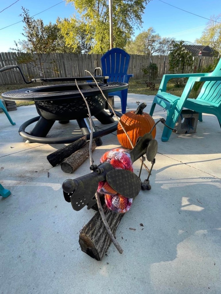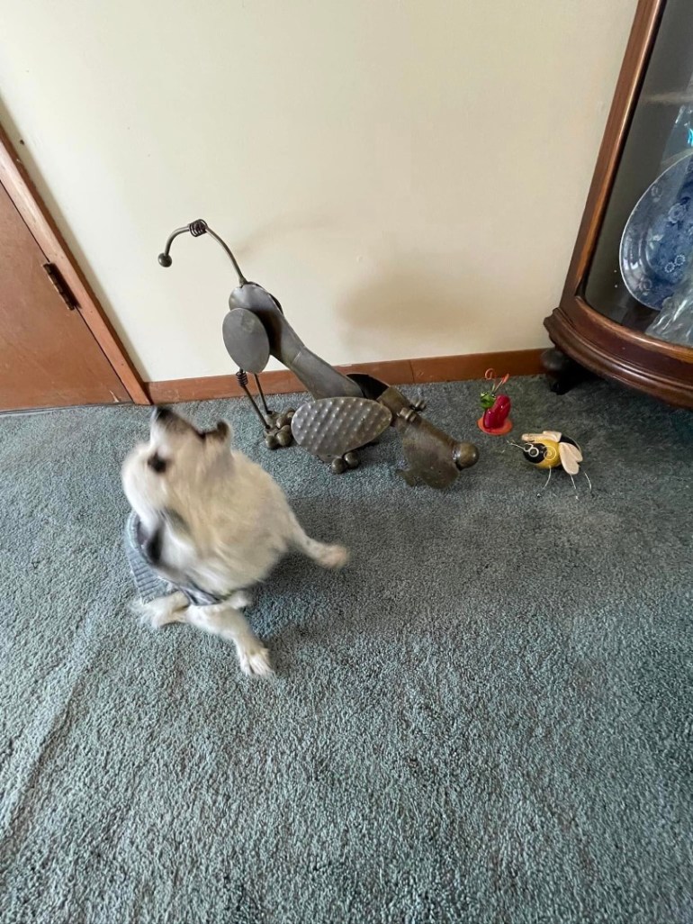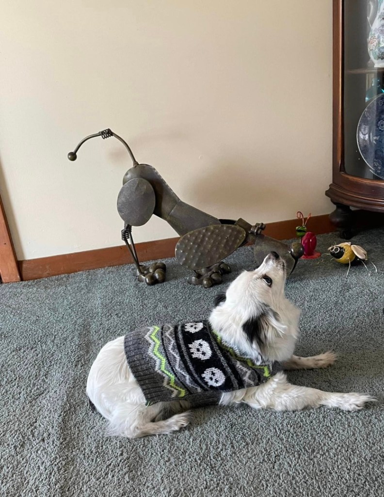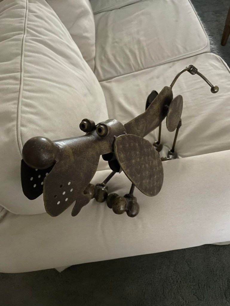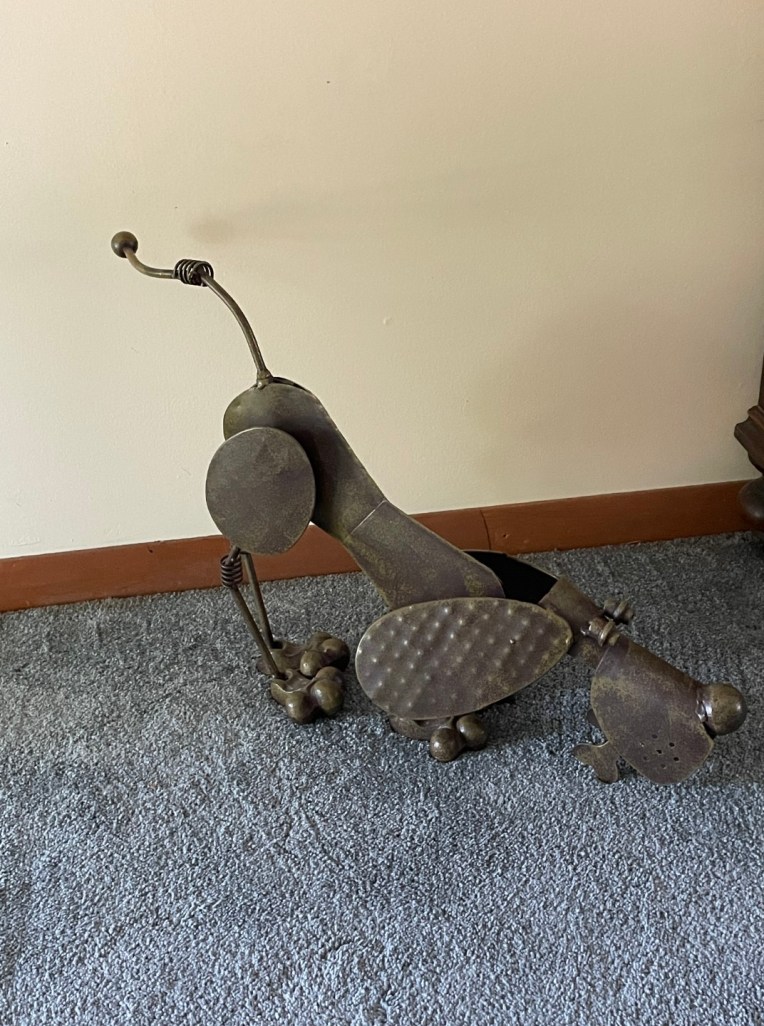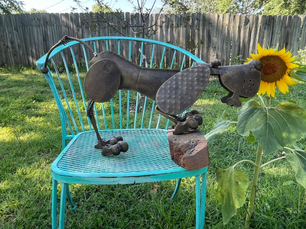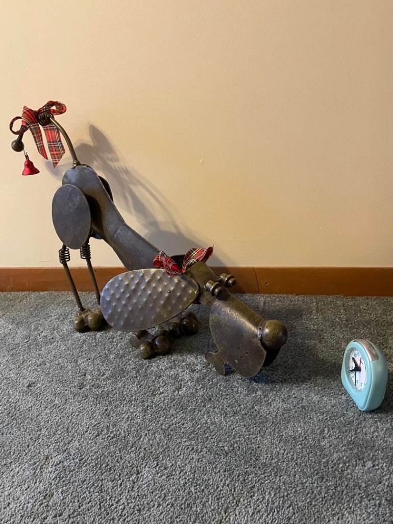 While shopping in a vintage market in Wichita in April, 2023, I spotted this cute metal dog. I walked by, then retraced my steps and took a closer look. The price tag showed $20 and that sealed the deal. I bought him. In sharing to my Facebook page, it was fun to see the reaction of my friends. A couple of them thought I’d adopted a real dog when they first saw the post, before looking carefully at the picture. They didn’t realize I’d decided a few years back that my lifestyle and budget didn’t afford me having a real pet. The gallery below consists of photos shared with my Facebook friends over several months, with captions of the actual posts. ~SueBee