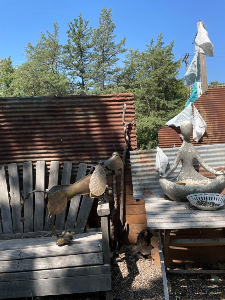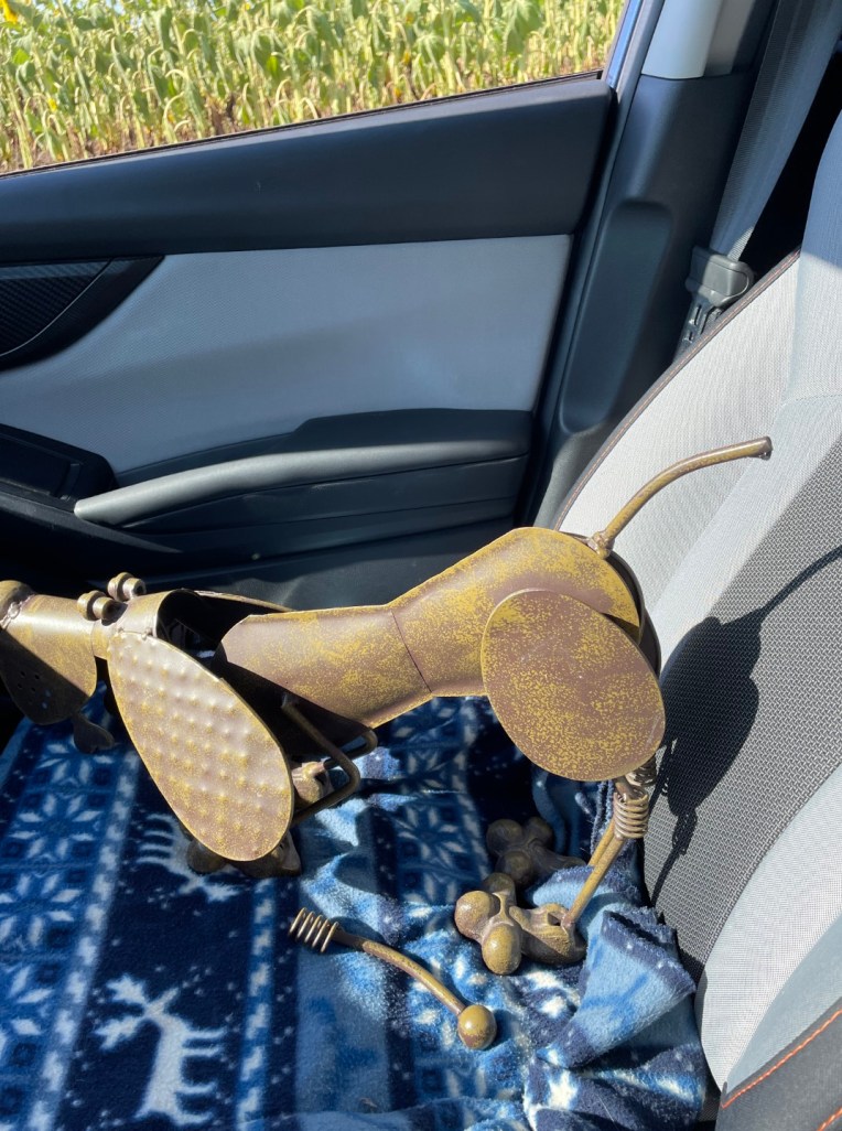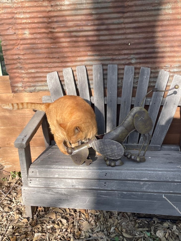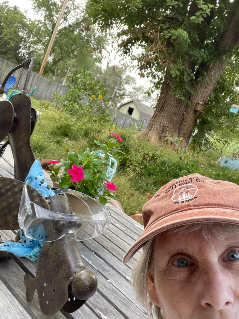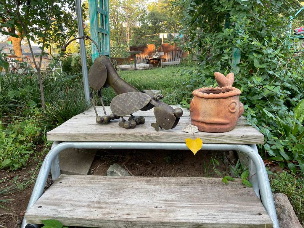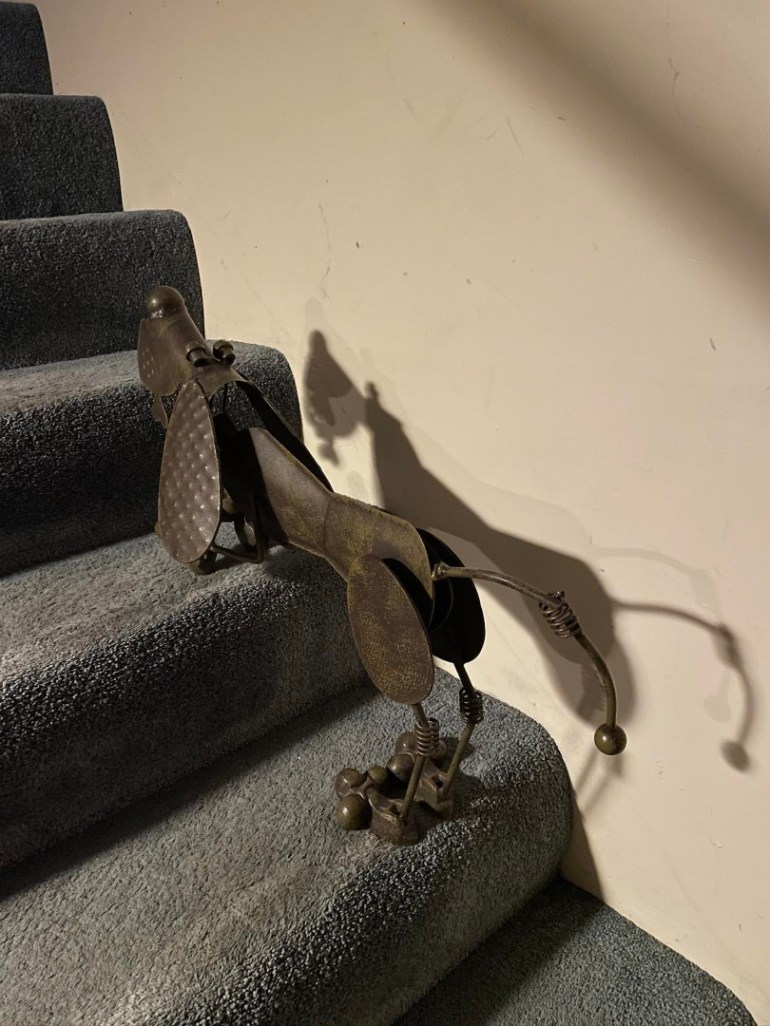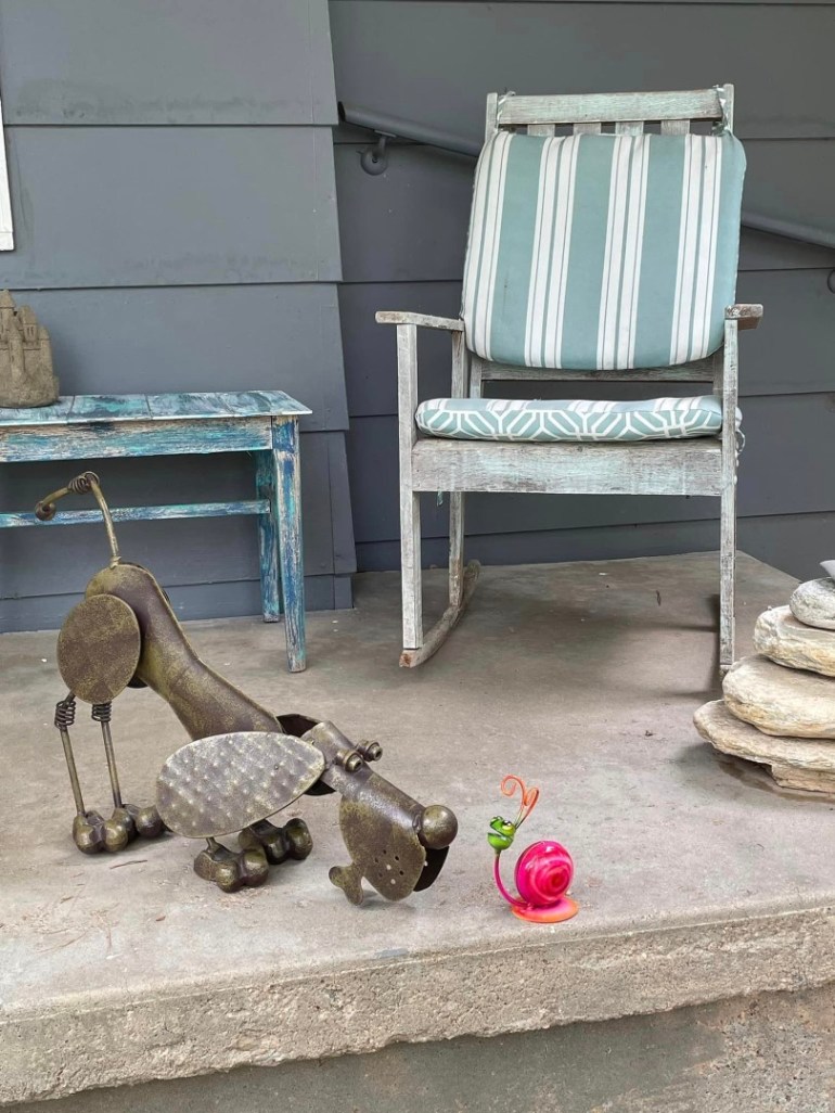 While shopping in a vintage market in Wichita in April, 2023, I spotted this cute metal dog. I walked by, then retraced my steps and took a closer look. The price tag showed $20 and that sealed the deal. I bought him. In sharing to my Facebook page, it was fun to see the reaction of my friends. A couple of them thought I’d adopted a real dog when they first saw the post, before looking carefully at the picture. They didn’t realize I’d decided a few years back that my lifestyle and budget didn’t afford me having a real pet. The gallery below consists of photos shared with my Facebook friends over several months, with captions of the actual posts. ~SueBee