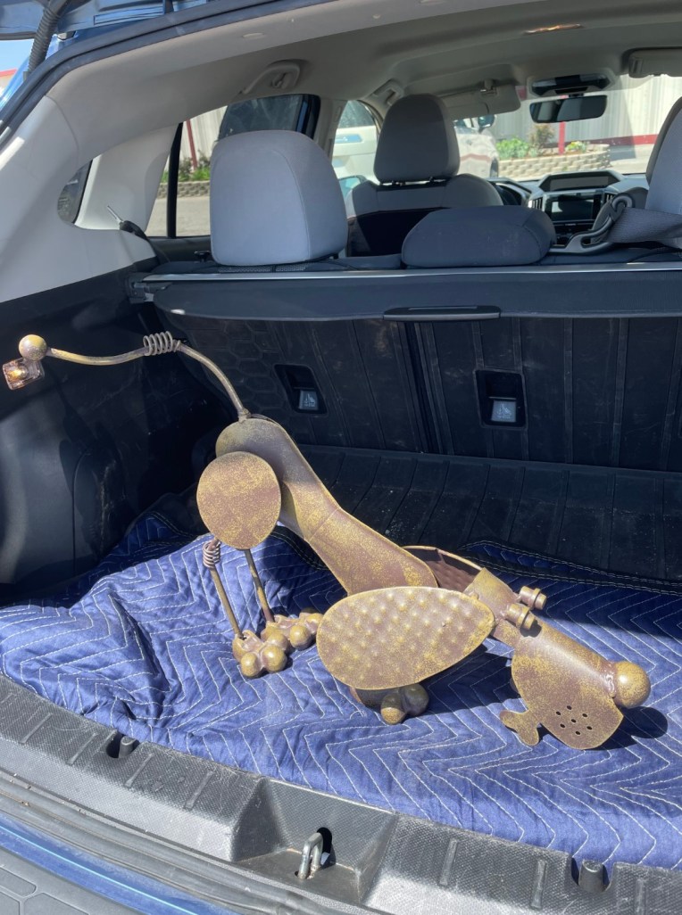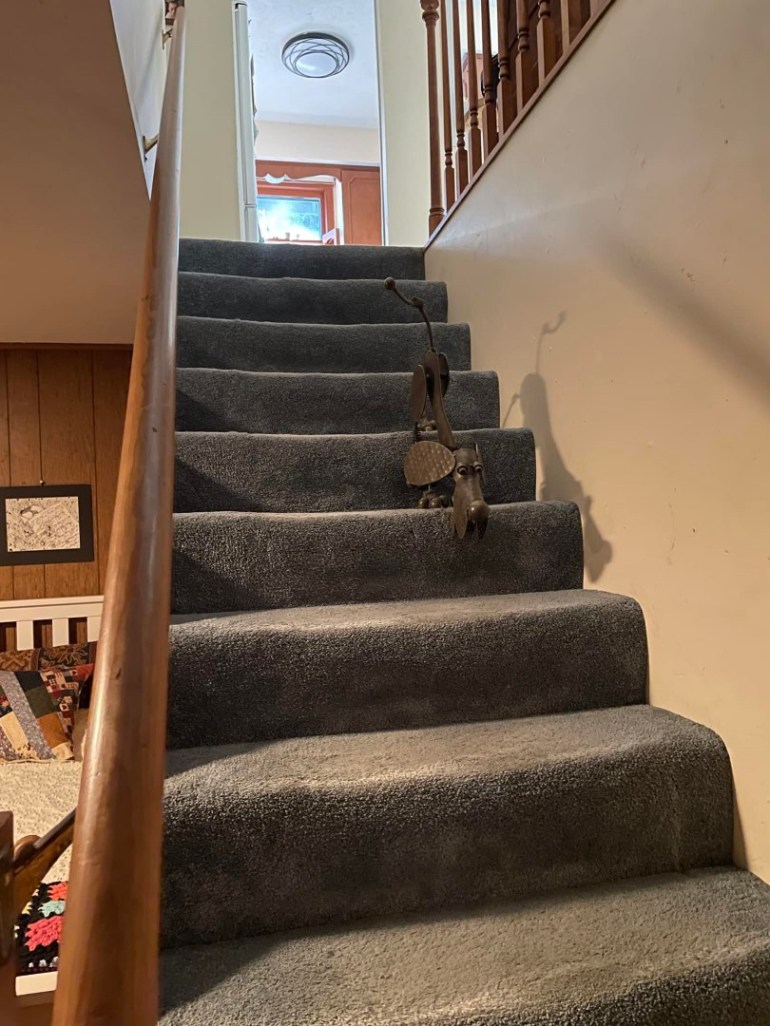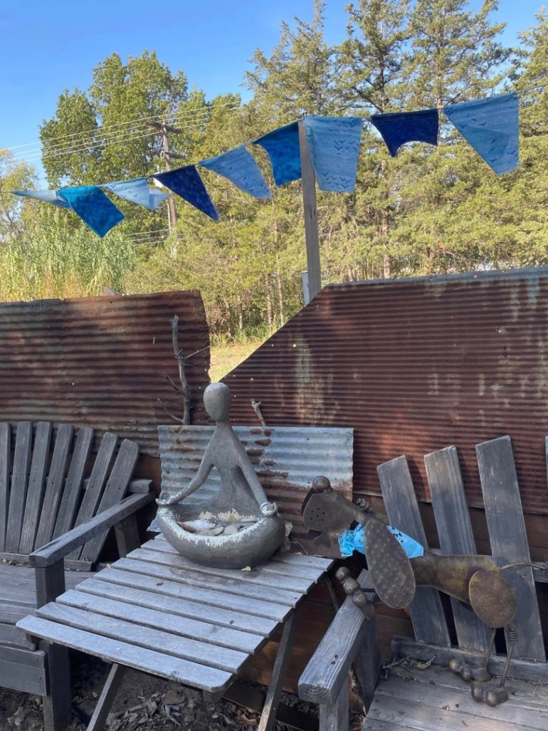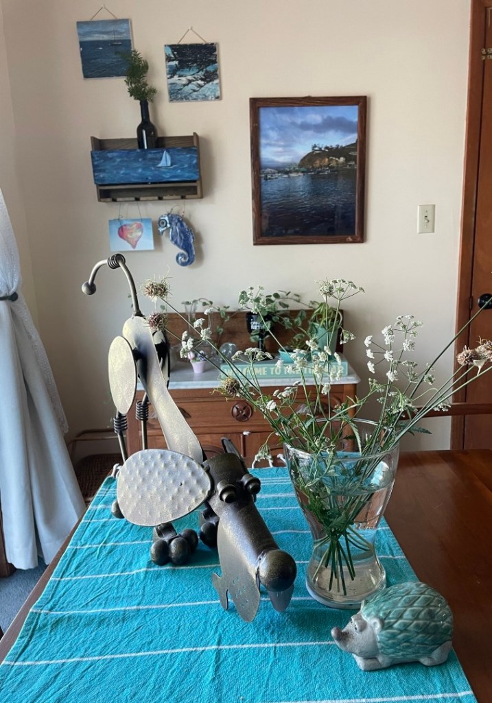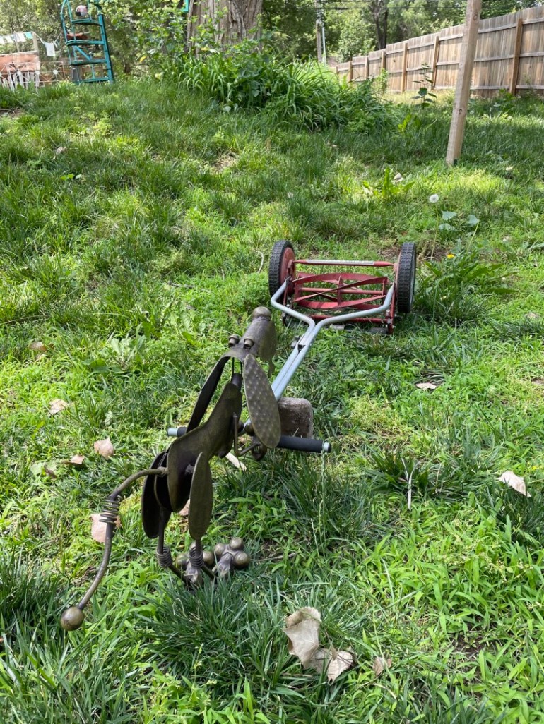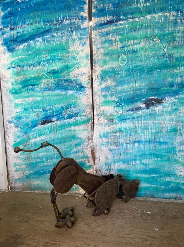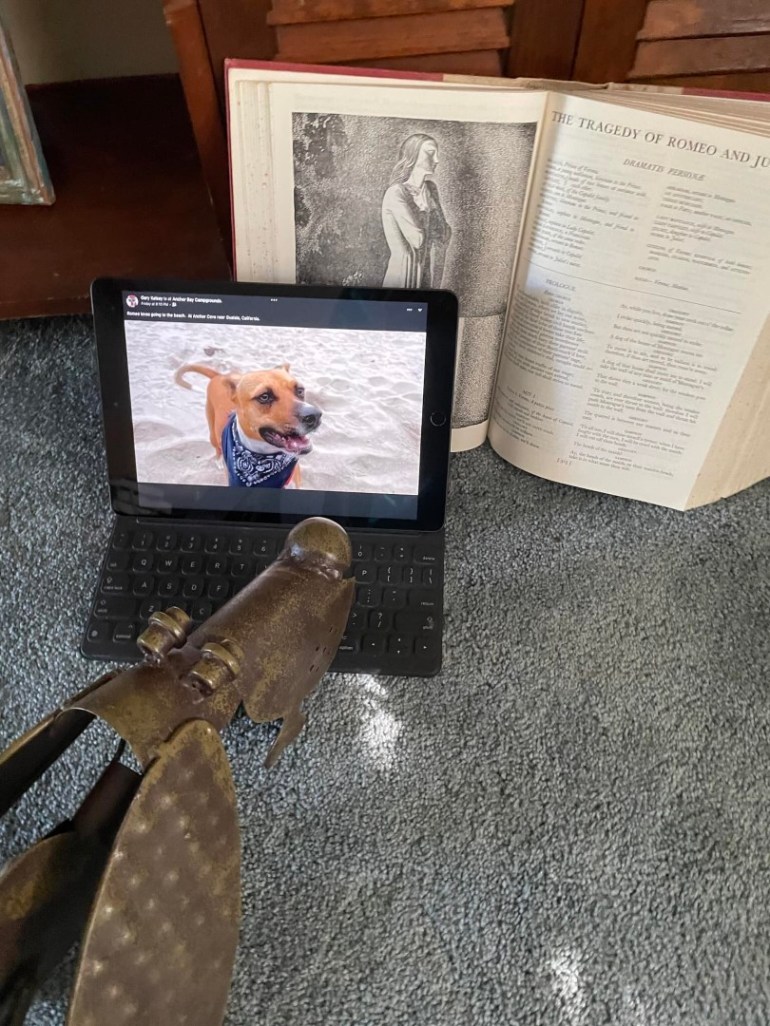 While shopping in a vintage market in Wichita in April, 2023, I spotted this cute metal dog. I walked by, then retraced my steps and took a closer look. The price tag showed $20 and that sealed the deal. I bought him. In sharing to my Facebook page, it was fun to see the reaction of my friends. A couple of them thought I’d adopted a real dog when they first saw the post, before looking carefully at the picture. They didn’t realize I’d decided a few years back that my lifestyle and budget didn’t afford me having a real pet. The gallery below consists of photos shared with my Facebook friends over several months, with captions of the actual posts. ~SueBee