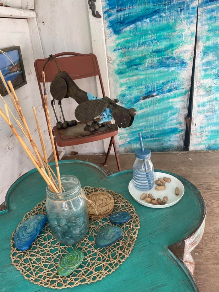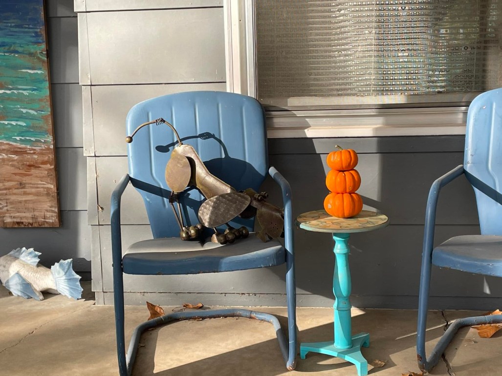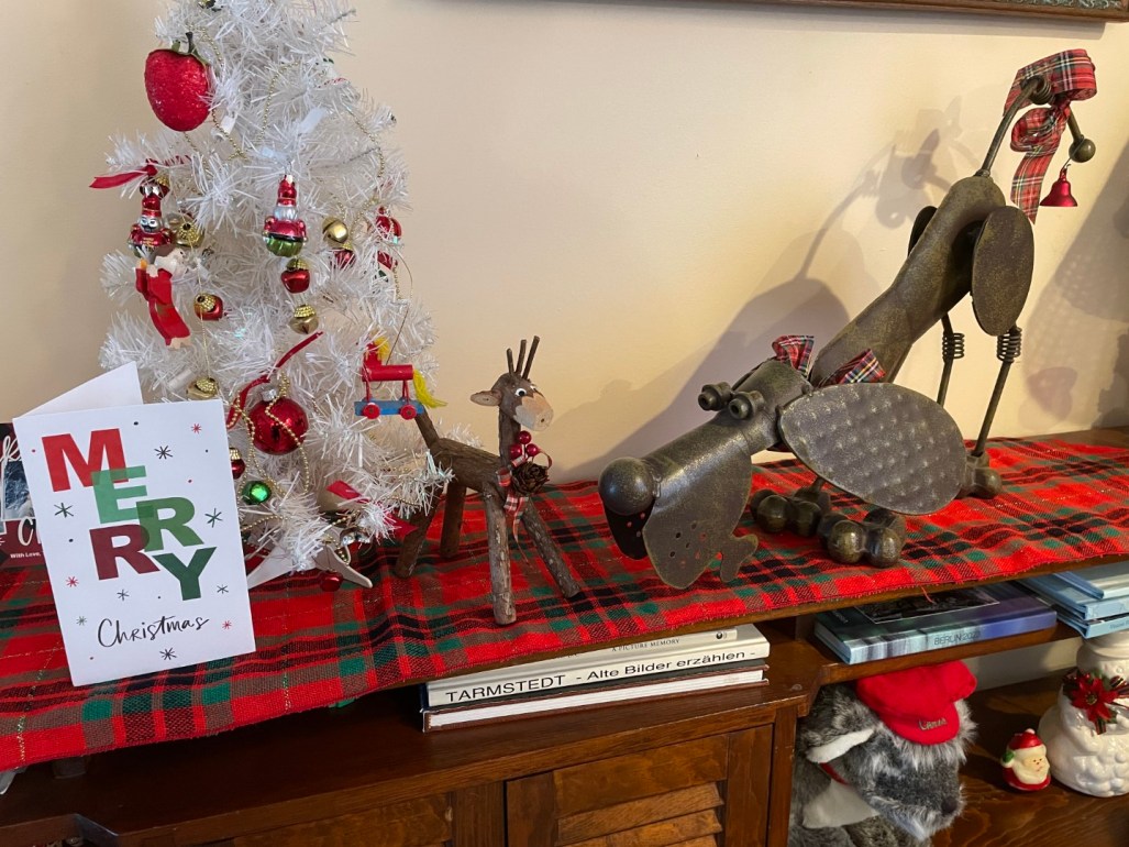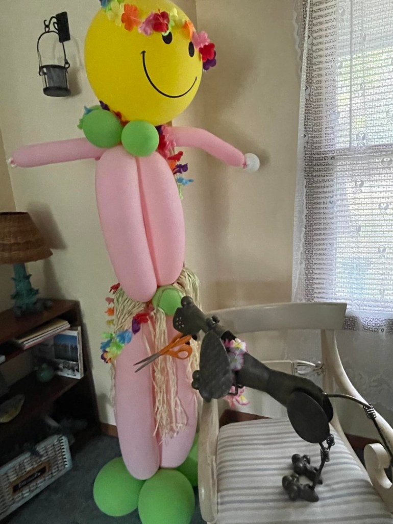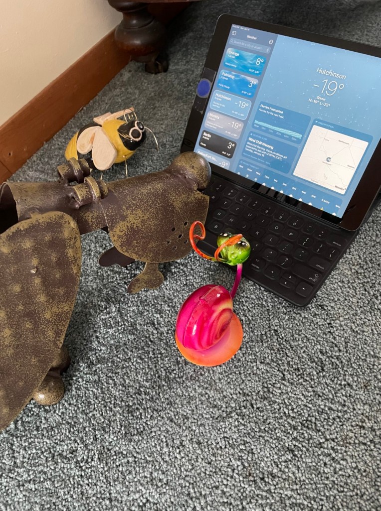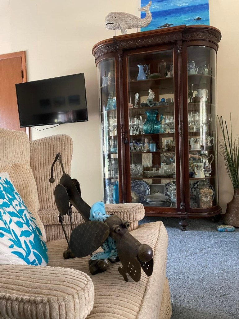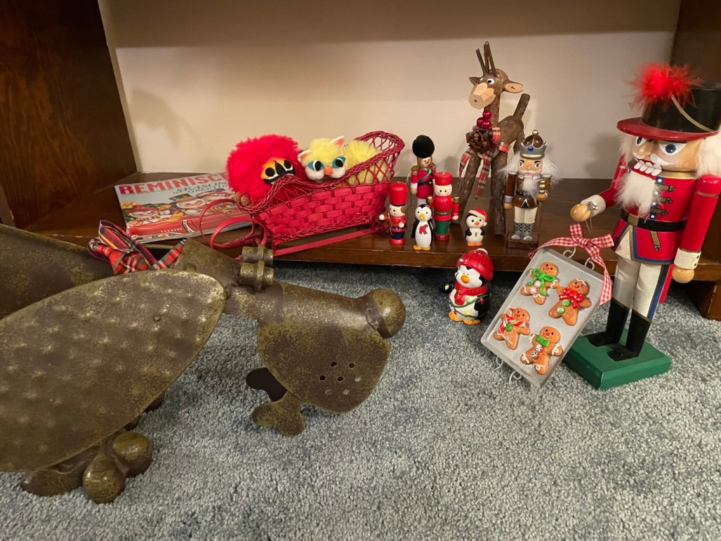 While shopping in a vintage market in Wichita in April, 2023, I spotted this cute metal dog. I walked by, then retraced my steps and took a closer look. The price tag showed $20 and that sealed the deal. I bought him. In sharing to my Facebook page, it was fun to see the reaction of my friends. A couple of them thought I’d adopted a real dog when they first saw the post, before looking carefully at the picture. They didn’t realize I’d decided a few years back that my lifestyle and budget didn’t afford me having a real pet. The gallery below consists of photos shared with my Facebook friends over several months, with captions of the actual posts. ~SueBee